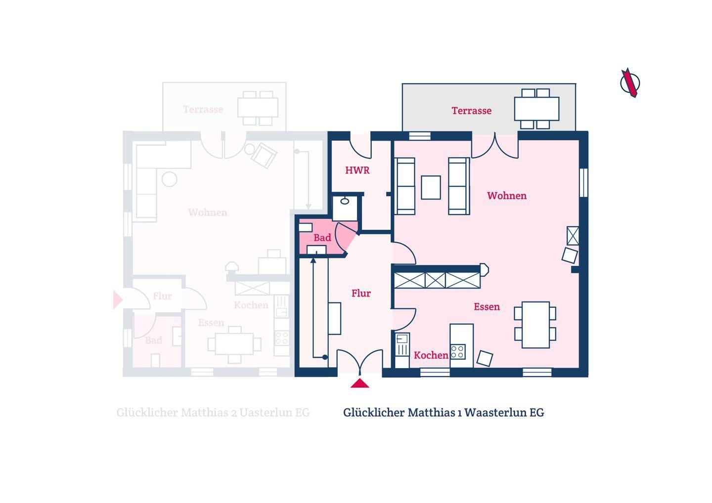 Im Erdgeschoss der Wohnung Waasterlun (zu deutsch Westerland) befindet sich ein großzügiger Wohn-/Essbereich mit Ofen und angrenzender Küche. Ein Bad mit bodengleicher Dusche finden Sie hier ebenfalls vor.