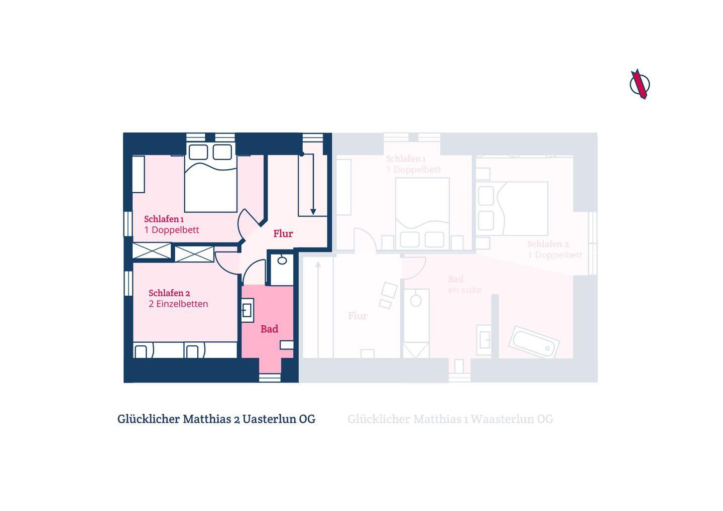 Im Erdgeschoss der Wohnung Uasterlun (zu deutsch Osterland) befindet sich ein großzügiger Wohn-/Essbereich mit Ofen und angrenzender Küche. Ein Gäste-WC finden Sie hier ebenfalls vor.