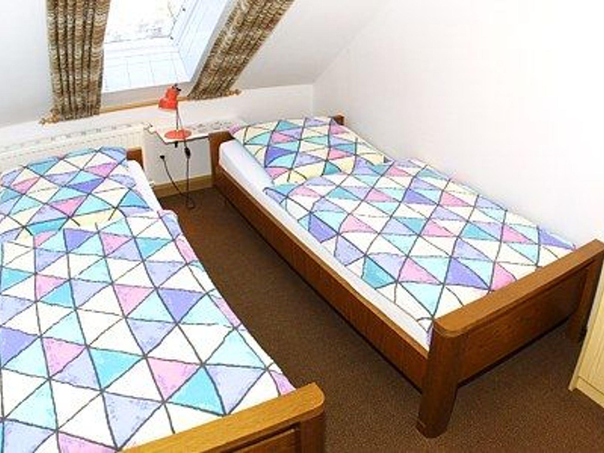 Größe ca. 60 Quadratmeter, Wohnraum mit integrierter Küche, Schlafzimmer, zweites separates Schlafzimmer/Kinderzimmer, Badezimmer mit Dusche, Waschtisch und WC, Obergeschoss, Terrasse (Sitzgruppe im Garten), optimal für 2 bis 4 Personen.