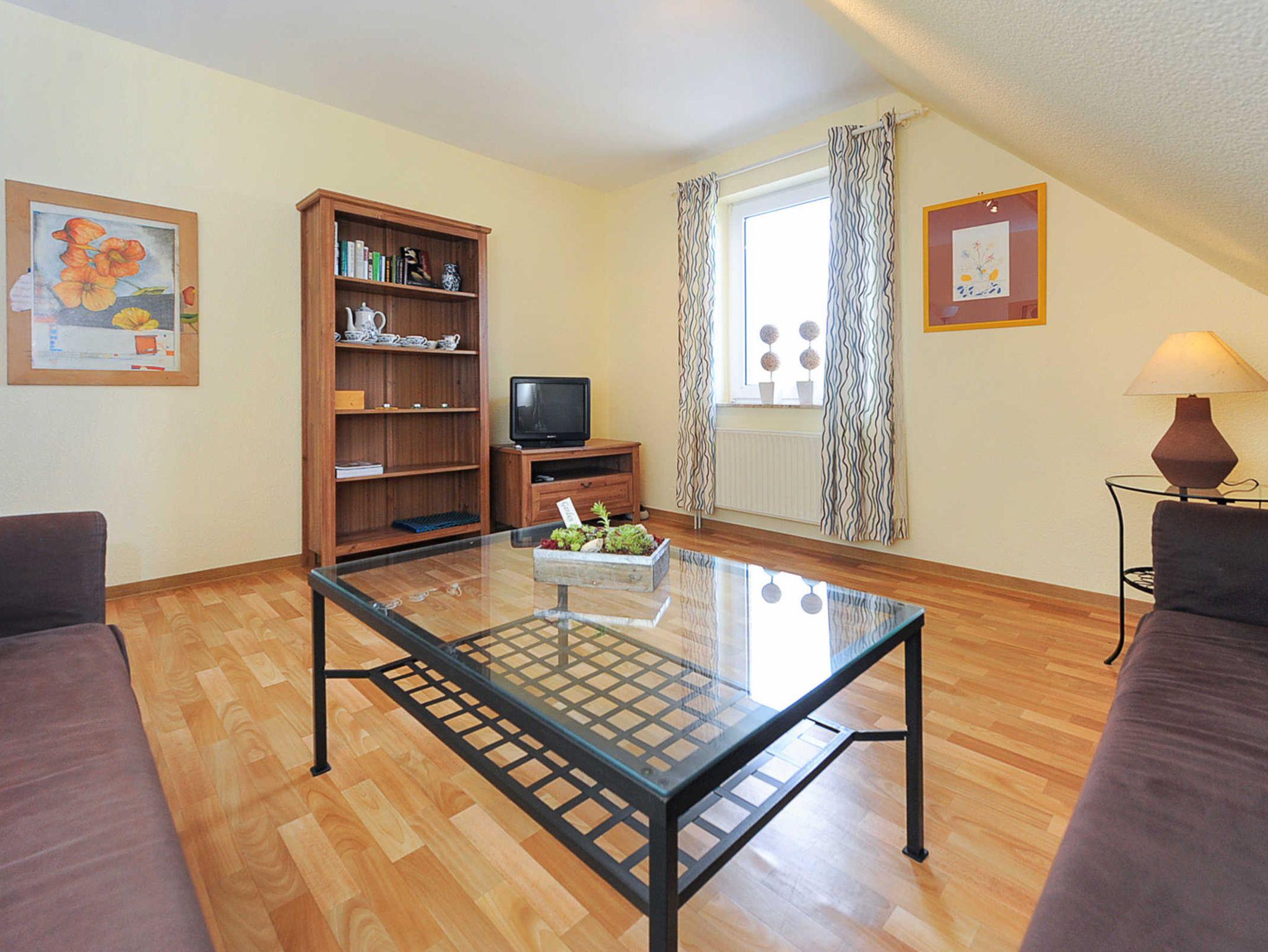 Größe ca. 50 Quadratmeter, Wohnzimmer, Küche, Schlafzimmer, Badezimmer mit Dusche, Waschtisch und WC, Obergeschoss, optimal für 2 Personen.