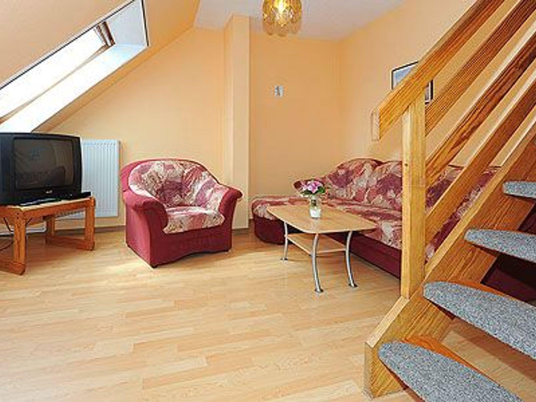 Größe ca. 65 Quadratmeter, Wohnraum mit integrierter Küche, Schlafzimmer, zweites separates, Schlafzimmer/Kinderzimmer, Badezimmer mit Dusche, Waschtisch und WC, Obergeschoss, Terrasse (Sitzgruppe im Garten), optimal für 2 bis 5 Personen und zusätzlich ein Kleinkind.