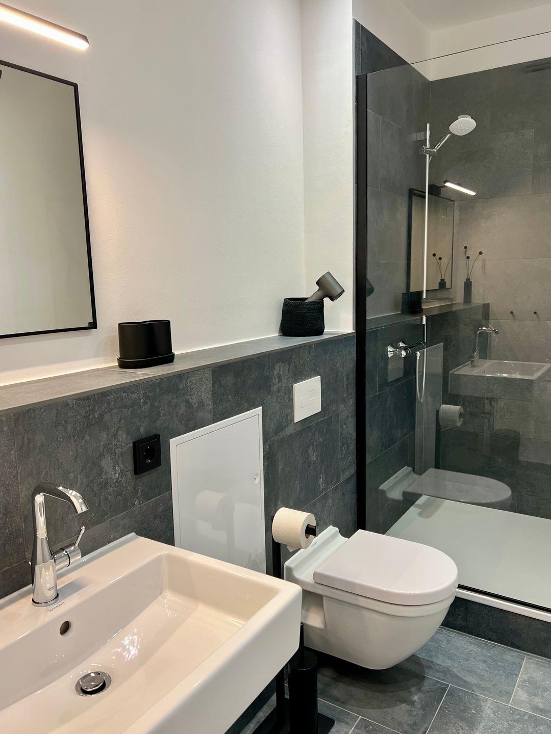 Das moderne Badezimmer mit Dusche verfügt über eine Handtuchheizung und ausreichend Ablagemöglichkeiten für deine persönlichen Kosmetikprodukte. Handtücher und einen Haartrockner bekommst du von uns gestellt.