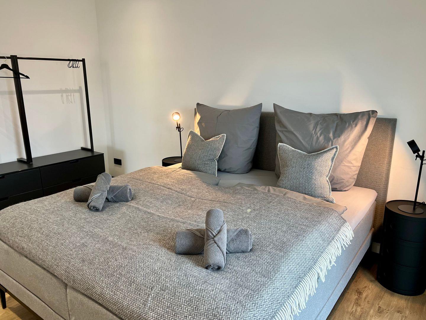 Ihr schlaft in zwei separaten Schlafzimmern mit jeweils einem hochwertigen Boxspring-Bett (180 cm x 200 cm), für das wir dir die Bettwäsche zur Verfügung stellen. In beiden Schlafzimmern hast du für einen ausgeruhten Schlaf die Möglichkeit, die Fenster mit Jalousien zu verdunkeln. Zudem bieten eine Kleiderstange und weitere Ablagemöglichkeiten Platz für dein Reisegepäck.