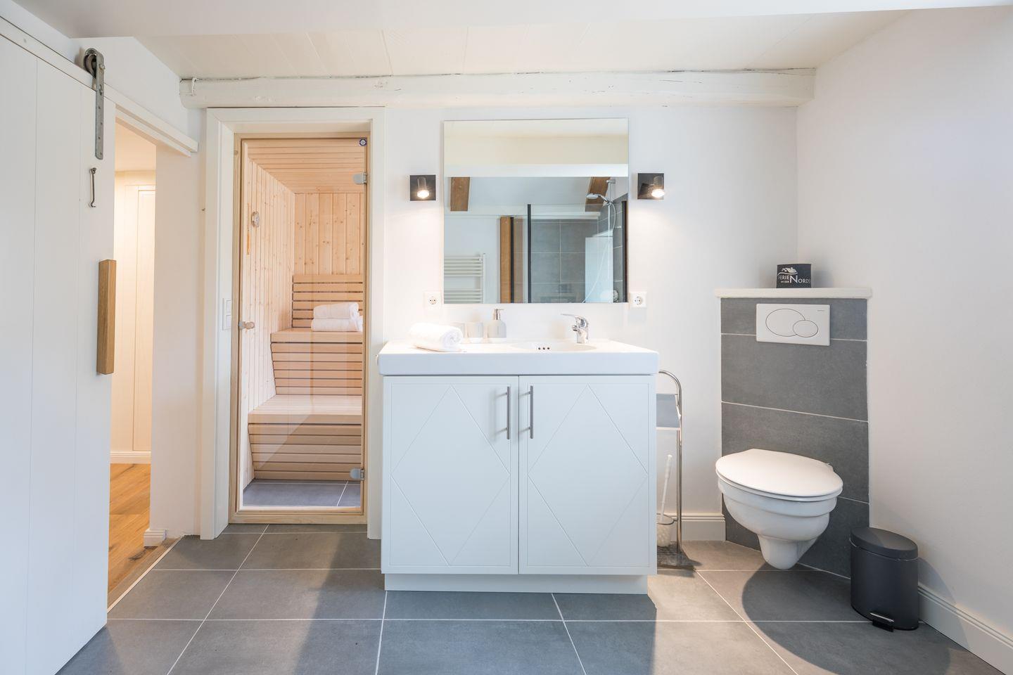 Das Duschbad mit der großen Sauna lädt zur Entspannung ein. Im Hauswirtschaftsraum steht Ihnen eine Waschmaschine zur Verfügung.