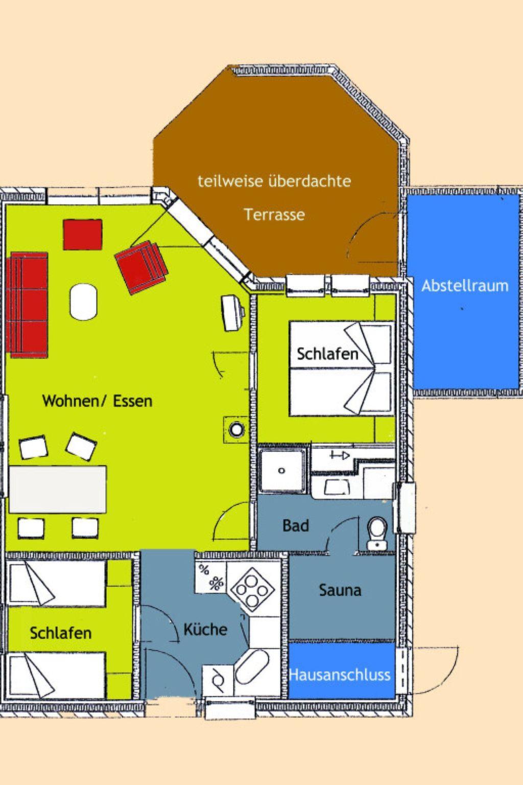 Das hochwertig eingerichtete Ferienhaus verfügt über ein großzügiges Wohn-/Esszimmer mit Kaminofen, 2 Schlafräume, eine komplett ausgestattete Einbauküche sowie ein Duschbad mit Sauna.