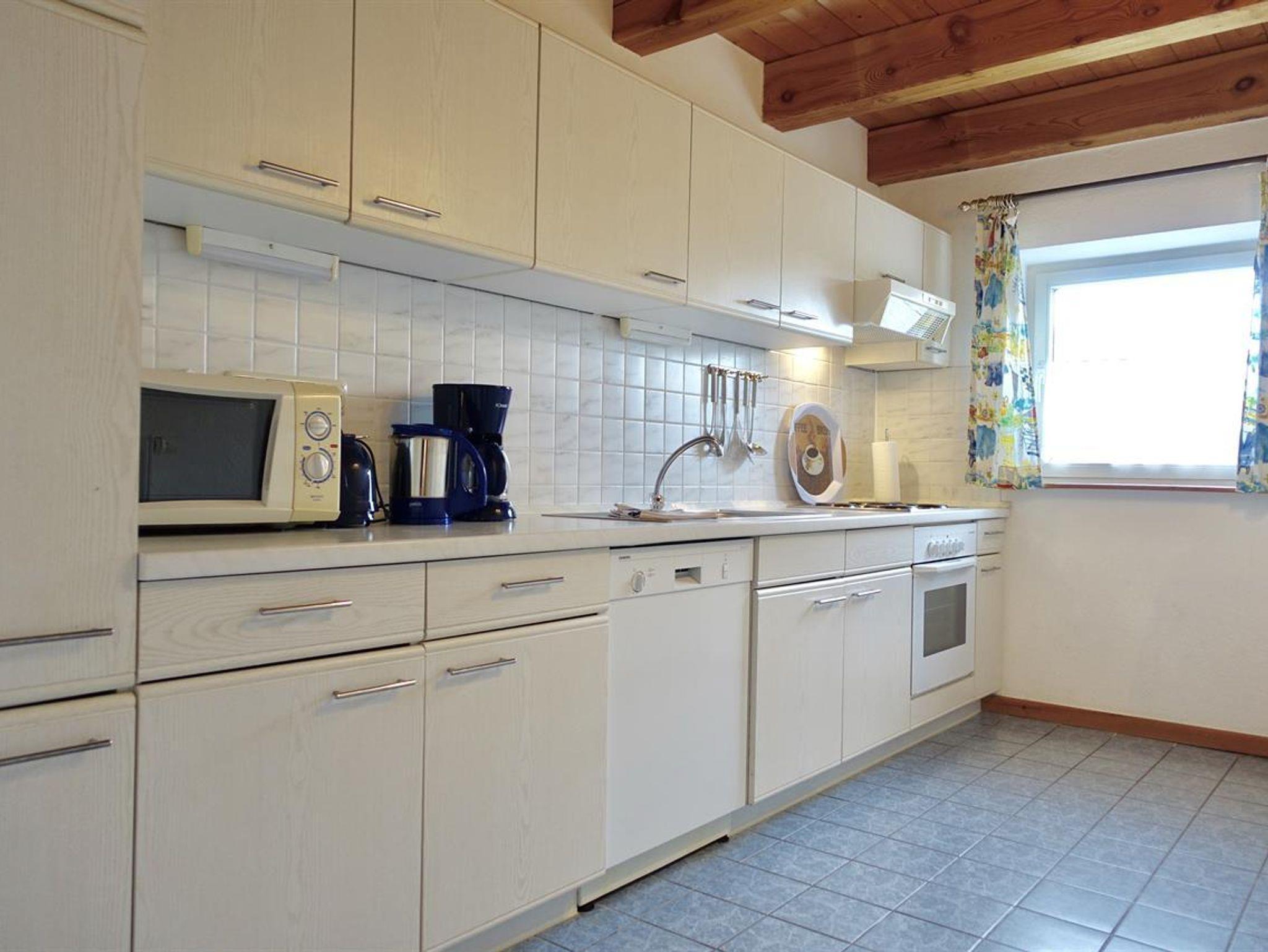 (Backofen, 4-Platten-Herd, Mikrowelle, Kaffeemaschine, Toaster, Geschirrspüler, Kühlschrank), eine großzügige Sofalandschaft mit TV und CD-Player/Radio sowie ein großes Badezimmer mit Dusche und WC. Im Obergeschoss sind zwei Schlafräume, eines mit einem Doppelbett (2 x 1,80m)
