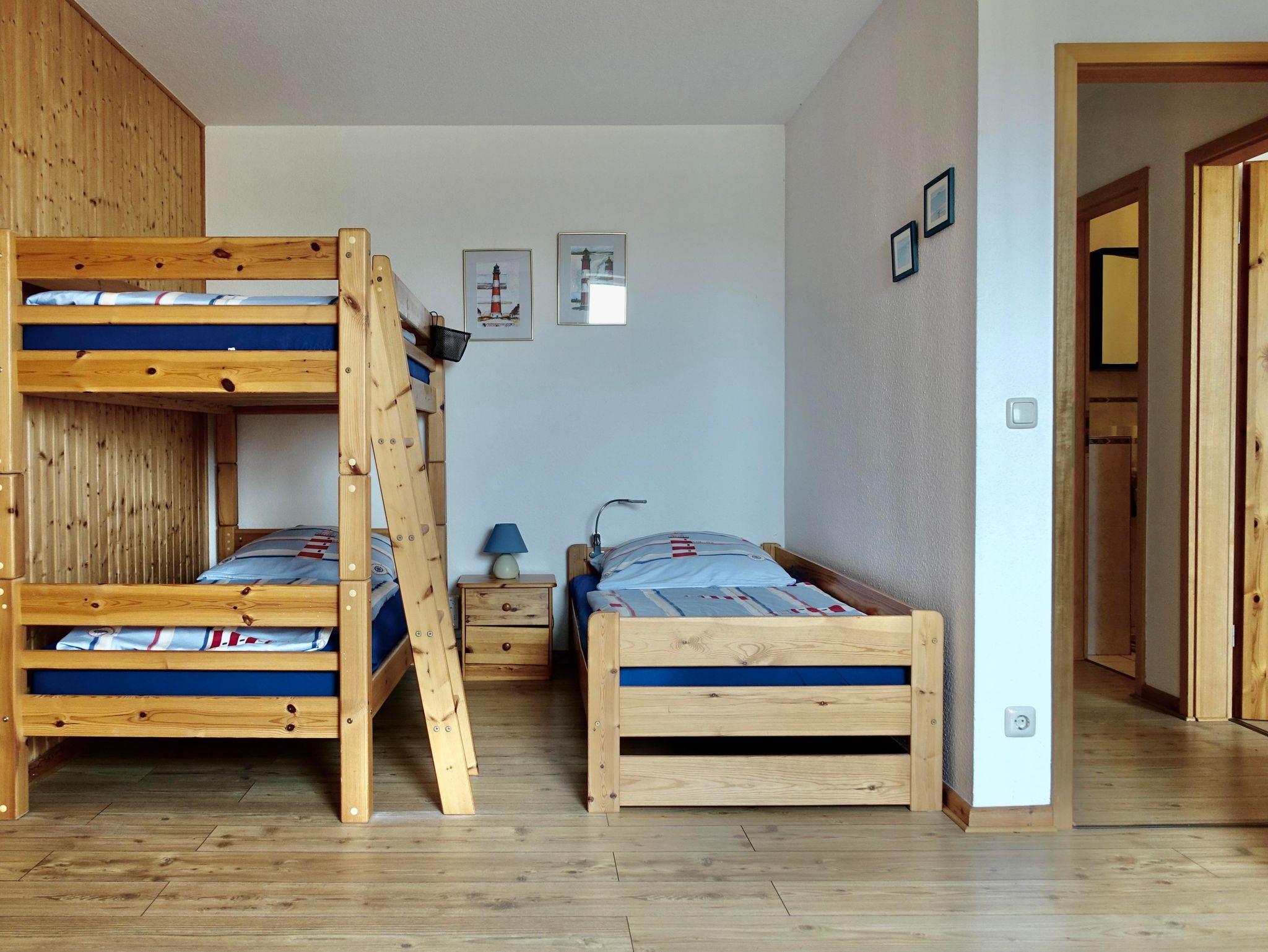 Bitte beachten, bei einer Belegung mit 6 erwachsenen Personen, steht für 3 Personen ein Schlafraum mit einem Etagenbett und einem Einzelbett zur Verfügung.