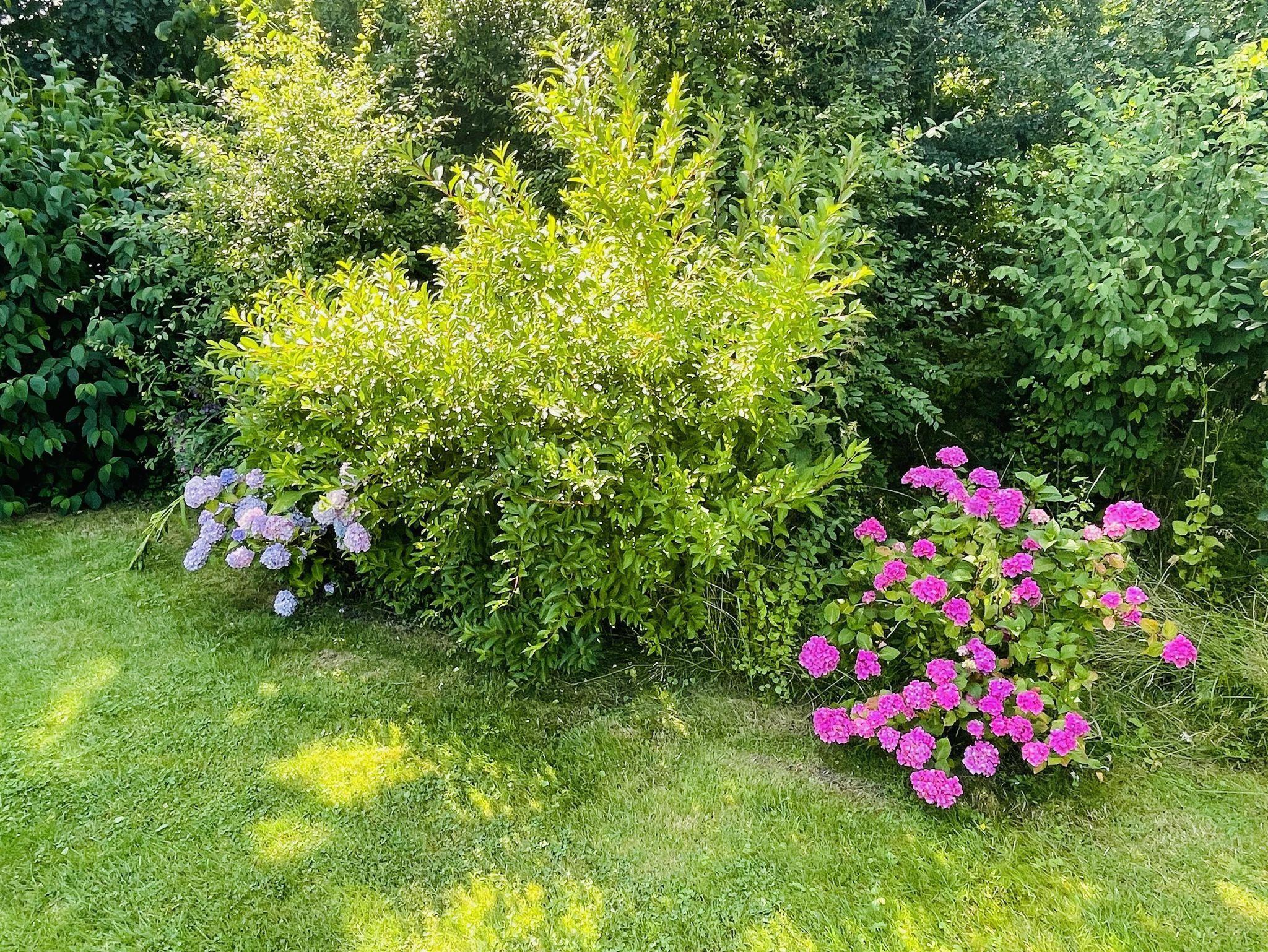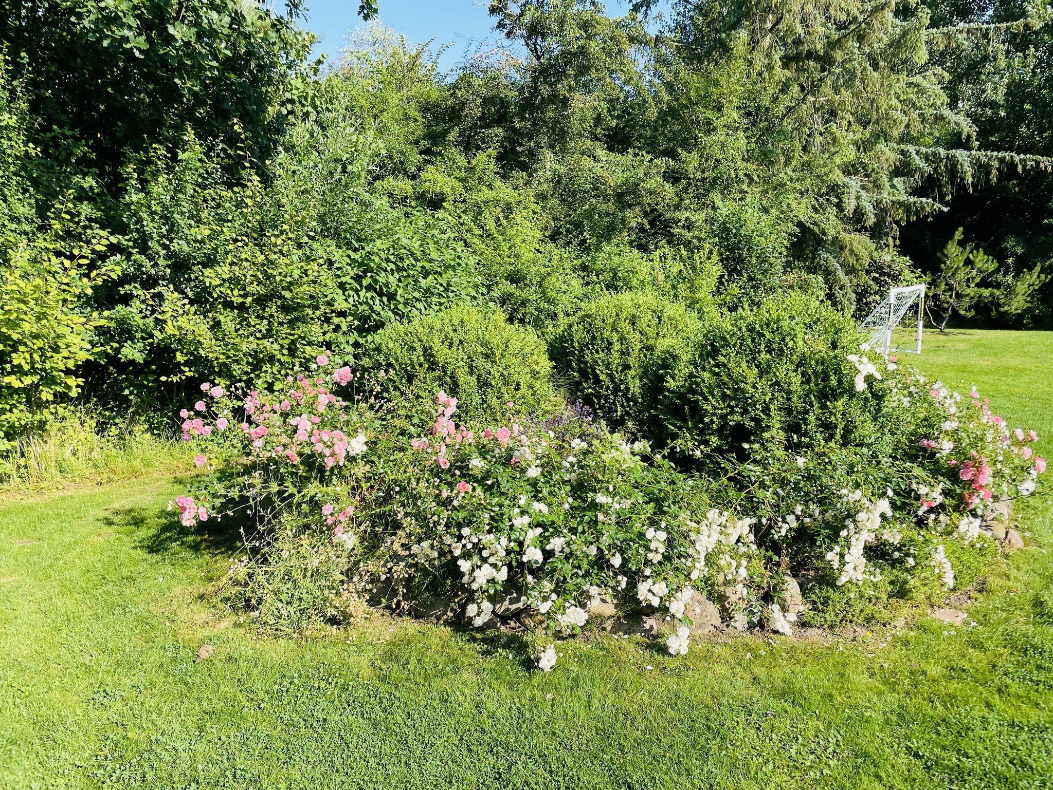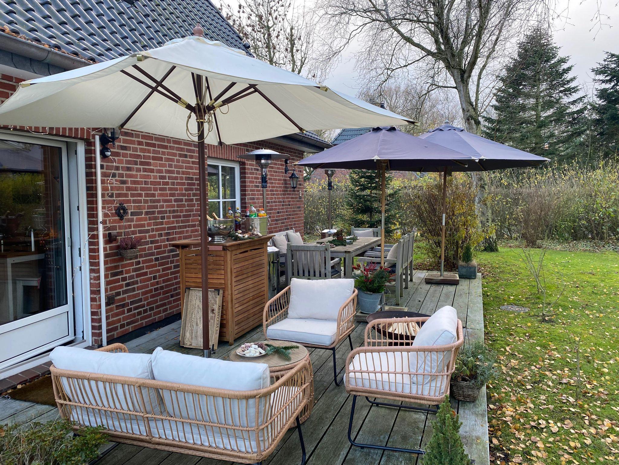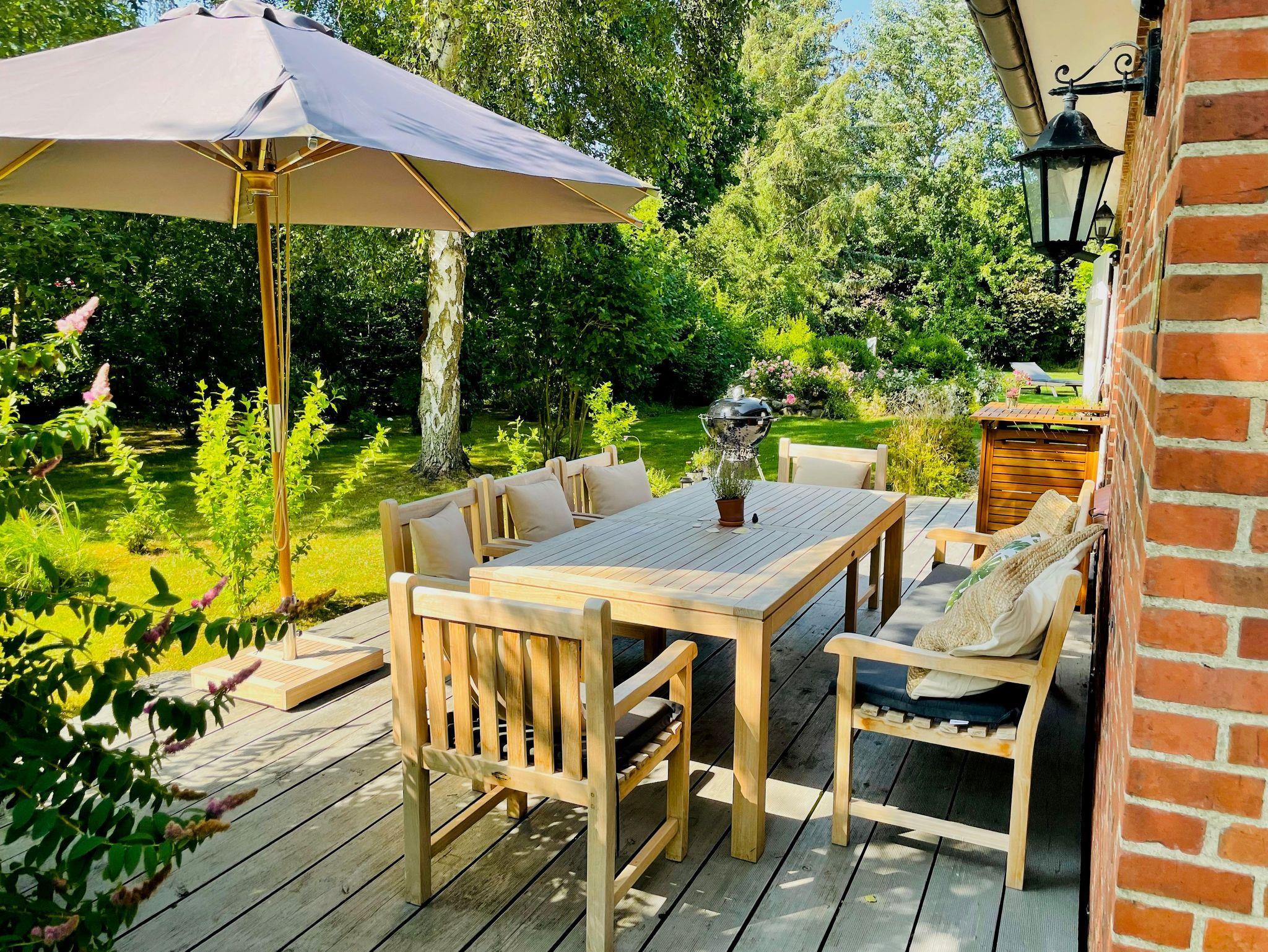 Der rd. 1500 m² große, schön angelegte Garten mit großer Sonnenterrasse und altem Obstbaumbestand steht Ihnen zur uneingeschränkten Nutzung zur Verfügung. Ob beim Relaxen auf der Sonnenliege, dem Spielen mit Kindern, dem Beobachten von Vögeln oder dem gemeinsamen Grillen, hier sind Sie ungestört. Es stehen hochwertige Gartenmöbel, Sonnenschirme und Outdoorkissen sowie Grill und Feuerschale zur Verfügung.