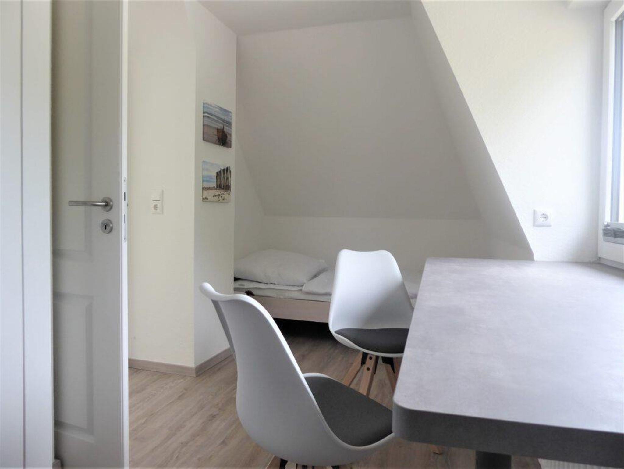 Schlafzimmer mit 2 Einzelbetten, Kleiderschrank, Schreibtisch vor dem Fenster.