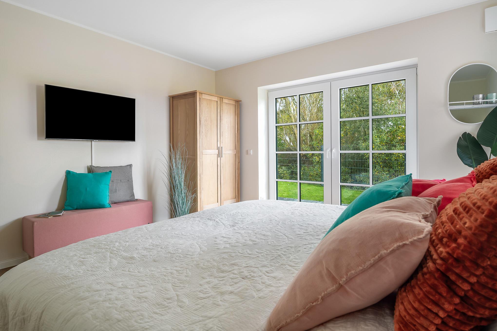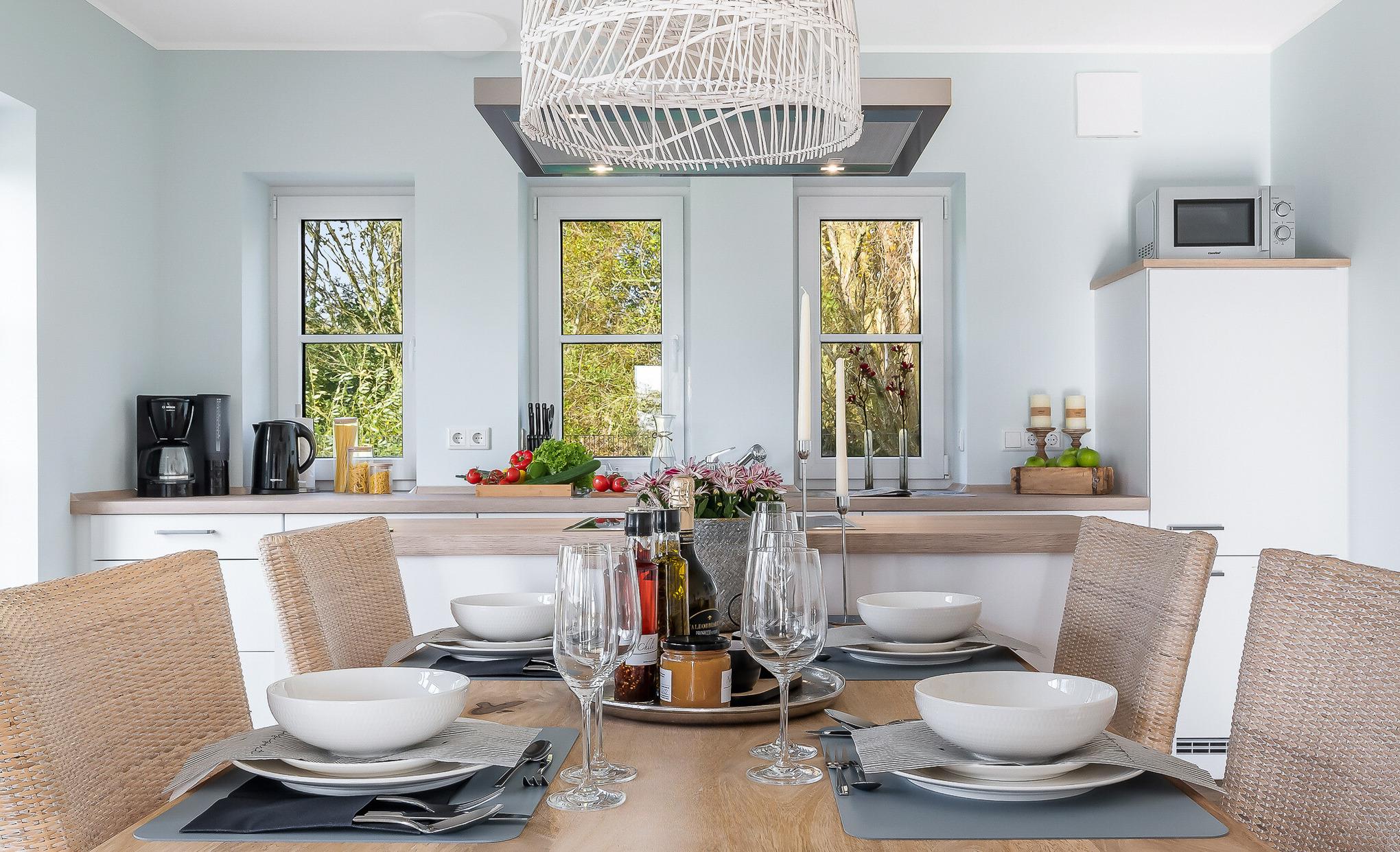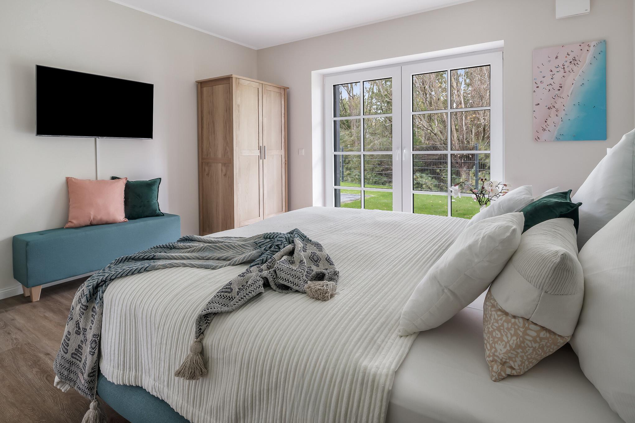 Diese elegante Unterkunft vereint modernen Komfort mit stilvollem Design und ist der ideale Rückzugsort. Genießen Sie die großzügigen Wohnräume, eine komplett ausgestattete Küche für Ihre kulinarischen Kreationen und ein gemütliches Wohnzimmer, ideal für entspannte Abende. Große Fenster fluten die Wohnung mit natürlichem Licht und bieten einen herrlichen Blick in den Garten.