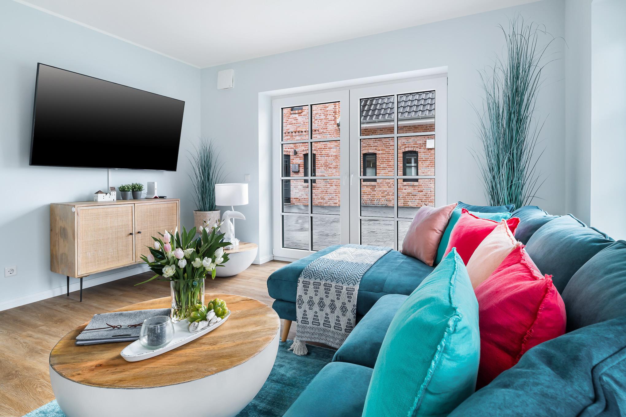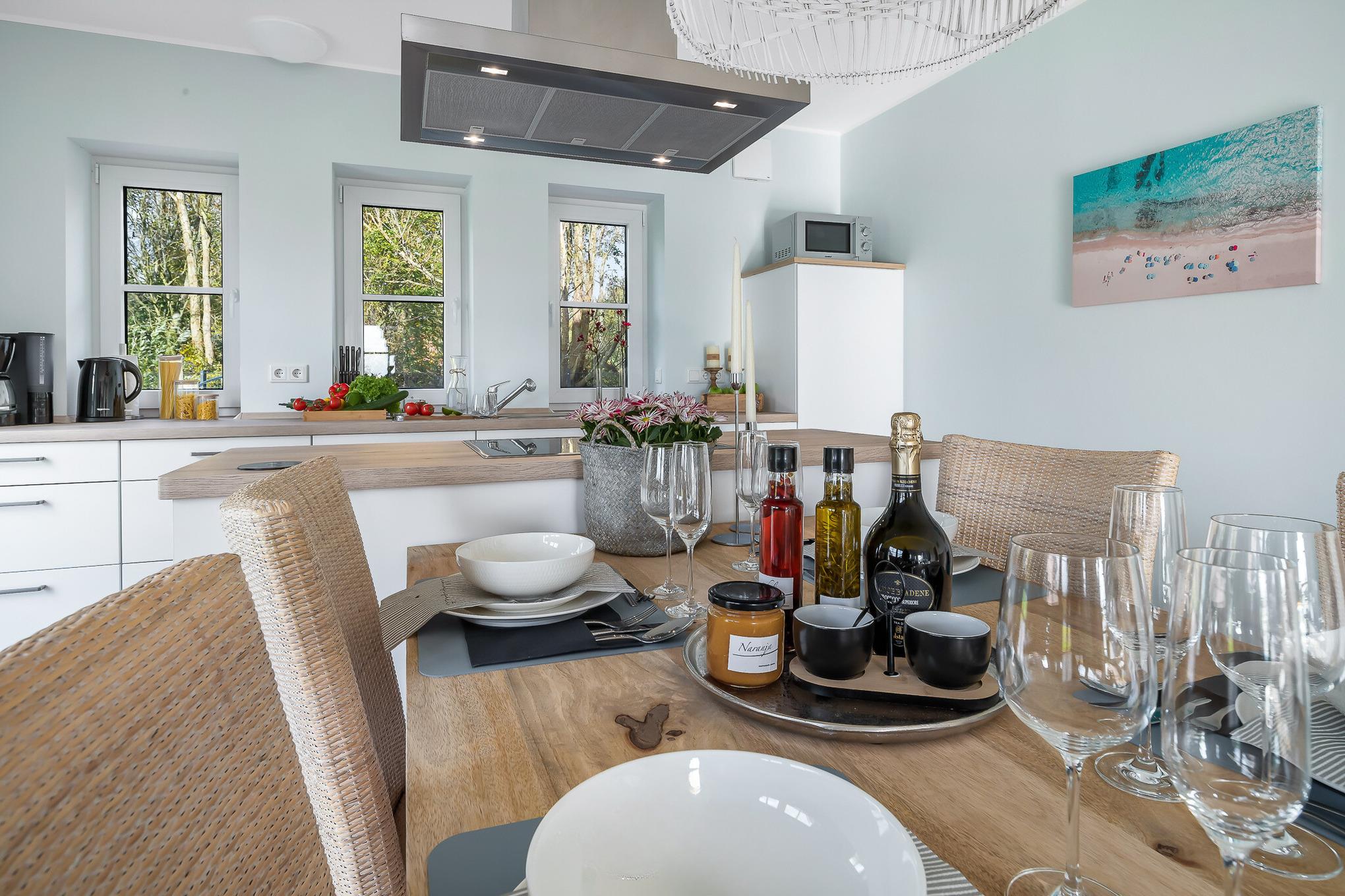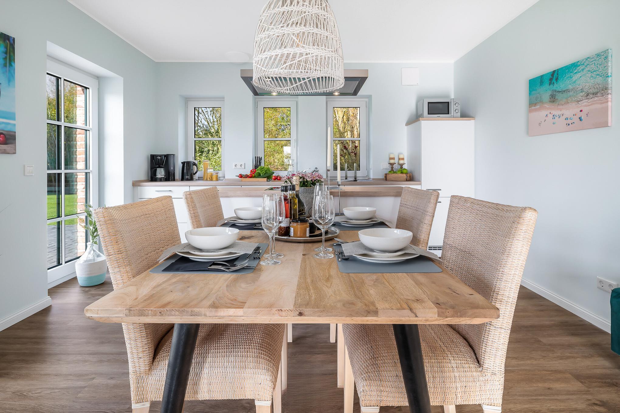 Diese elegante Unterkunft vereint modernen Komfort mit stilvollem Design und ist der ideale Rückzugsort. Genießen Sie die großzügigen Wohnräume, eine komplett ausgestattete Küche für Ihre kulinarischen Kreationen und ein gemütliches Wohnzimmer, ideal für entspannte Abende. Große Fenster fluten die Wohnung mit natürlichem Licht und bieten einen herrlichen Blick in den Garten.