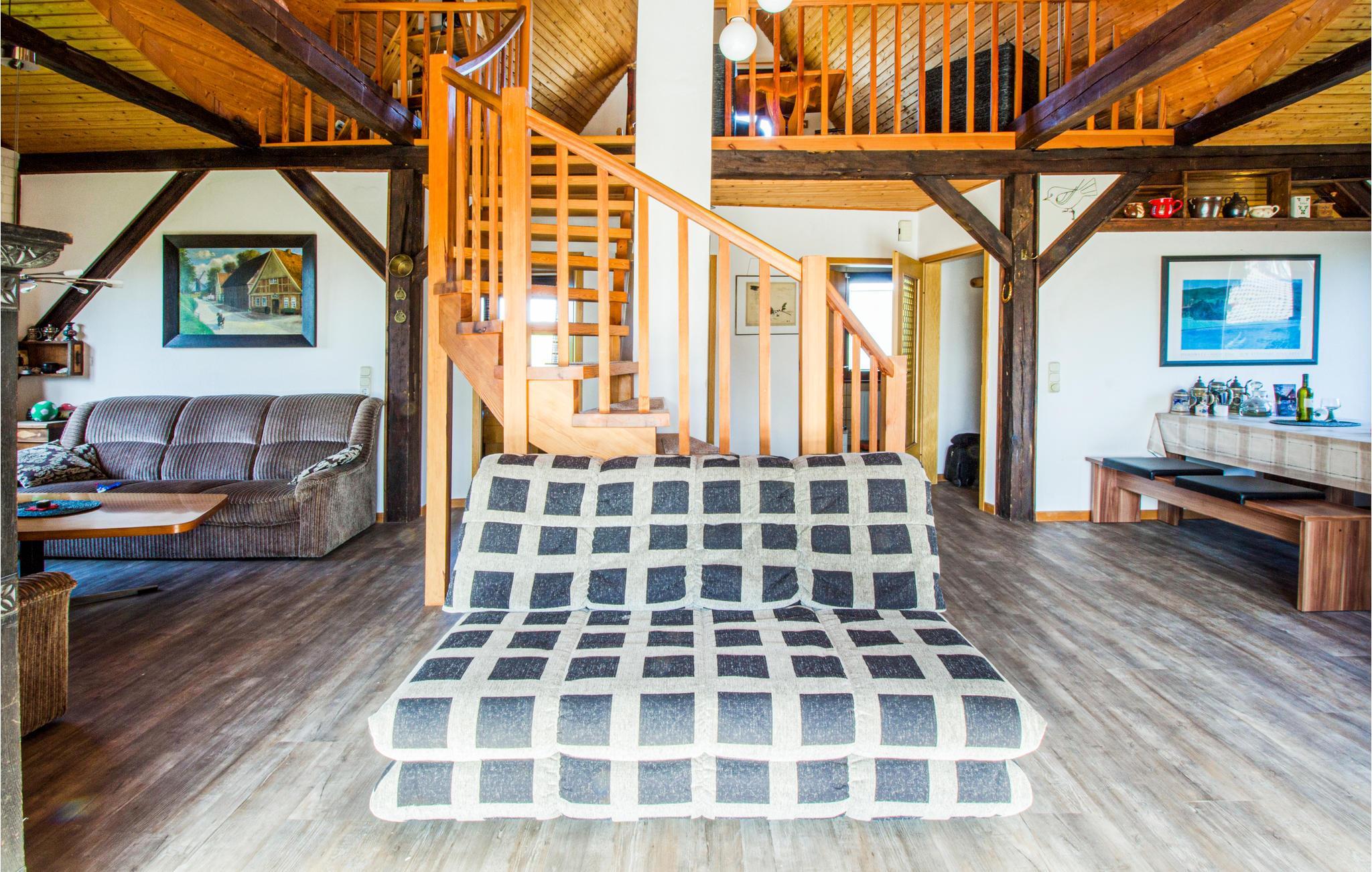 Diese charmante Maisonette-Wohnung befindet sich im 1. Und 2. Stock und bietet Ihnen einen tollen Panoramablick auf das Wasser aus dem Sitzbereich im oberen Stockwerk. Hier blicken Sie über den Deich der Elbe und können Schiffe aller Größe beobachten, die auf dem Weg nach oder von Hamburg sind. Die rustikal-gemütliche Einrichtung macht die Wohnung zu einem angenehmen Aufenthaltsort.