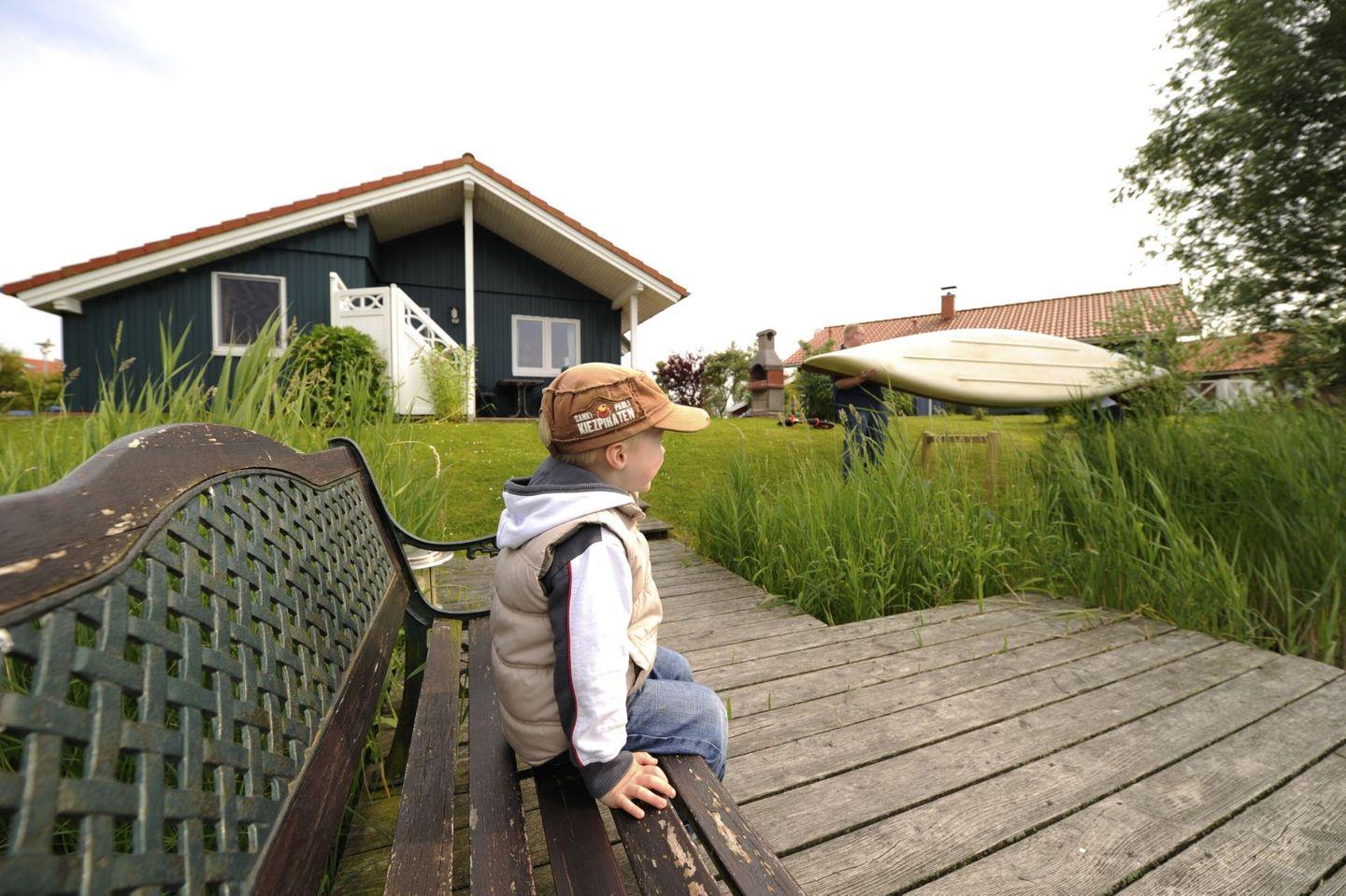 Das Ferienhaus verfügt über einen großen Wohnraum mit Couchgarnitur und einer separaten Essecke. Hier stehen Ihnen der große LCD-Flat-TV sowie der Kaminofen für entspannte Fernsehabende zur Verfügung. In der offenen Küche finden Sie die Geschirrspülmaschine, das Ceranfeld mit Backofen, die Mikrowelle, die Kaffeemaschine, den Toaster, sowie ausreichend Geschirr. Zwei der drei Schlafzimmer sind mit einem Ehebett, sowie einem separaten Fernseher ausgestattet. Das Kinderzimmer ist bunt gestaltet und mit zwei einzeln stehenden Betten versehen. Hier finden Sie für die kleinen Gäste auch das Spielzeug sowie eine Wickelmöglichkeit. In dem großen Badezimmer befinden sich die Sauna, die Whirlpoolwanne, sowie die Dusche mit Rainshower. Hier können Sie entspannen und die Seele baumeln lassen. Praktisch ist auch das separate Gäste-WC. Im Garten finden Sie für unsere kleinen Gäste eine Schaukel, sowie einen Sandkasten. Die große Terrasse ist teilweise überdacht. Hier stehen auch der Kamingrill und ausreichend Gartenmöbel. Auf dem Bootssteg steht eine Sitzecke für Sie bereit. Hier können Sie morgens auf dem Wasser frühstücken oder einfach Ihren Blick über das Wasser schweifen lassen.