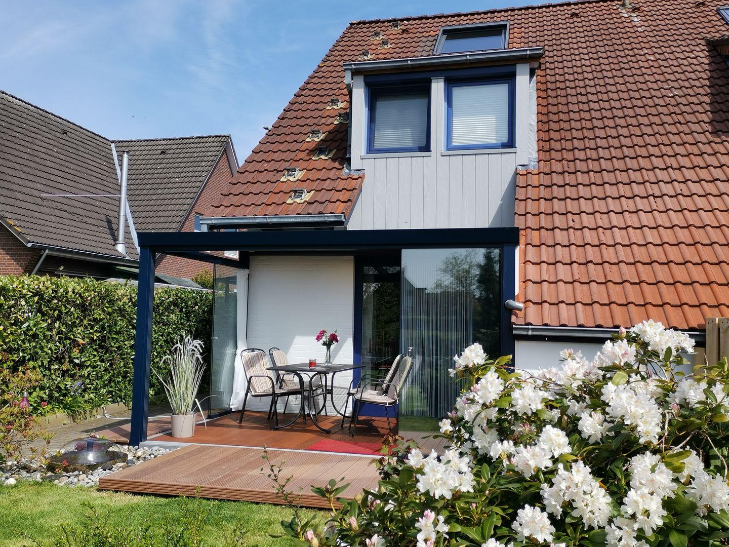 Das gemütlich und modern eingerichtete Ferienhaus „Medemsonne“ für 4 Personen ist in einer ruhigen Sackgasse direkt an dem Fluss Medem gelegen. Über den angrenzenden Fußweg ist die Otterndorfer Altstadt mit den vielen Einkaufmöglichkeiten, Restaurants und Kneipen schnell und bequem zu erreichen. Auch der Strand und die Freizeitanlagen sind nur ca. 1,5 km entfernt. Der großzügige Wohnbereich im Erdgeschoss mit Kaminofen, Essecke und Couchgarnitur lädt zum Verweilen ein. Hier steht Ihnen jeglicher Komfort, wie z. B. Smart-TV, Stereoanlage und WLAN zur Verfügung. Ebenfalls befinden sich die separate Küche, sowie ein Comfort-Gäste-WC im Erdgeschoss. Über eine geschlossene Holztreppe gelangen Sie in das Obergeschoss. Hier befinden sich die beiden Schlafzimmer, sowie das Badezimmer mit Dusche, Wanne und WC und eine Sauna mit 2 Liegen oder 4 Sitzplätzen. Von dem südlichen Schlafzimmer mit Ehebett haben Sie einen herrlichen Ausblick auf die Medem. Das zweite Schlafzimmer ist mit zwei einzeln stehenden Betten und einem Kinderbett ausgestattet. Die Süd-Terrasse erreichen Sie direkt vom Wohnbereich. Seit 2023 ist die Terrasse vollständig mit Glas überdacht und zum Windschutz mit Glastüren versehen. In diesem „Gartenzimmer“ lässt sich auch schon in den Übergangszeiten im Herbst und Frühling bei schönem Sonnenwetter warm und gemütlich verweilen. An den heißen Sonnentagen ist eine variable Verschattung möglich. Für sportliche Aktivitäten steht ein Kanu (Kanadier, 3 Pers. ) zur Verfügung. Der Zugang zur Medem führt durch den südl. Garten direkt zum hauseigenen Bootsanleger. Dieser lädt zum Verweilen am Fluss ein.