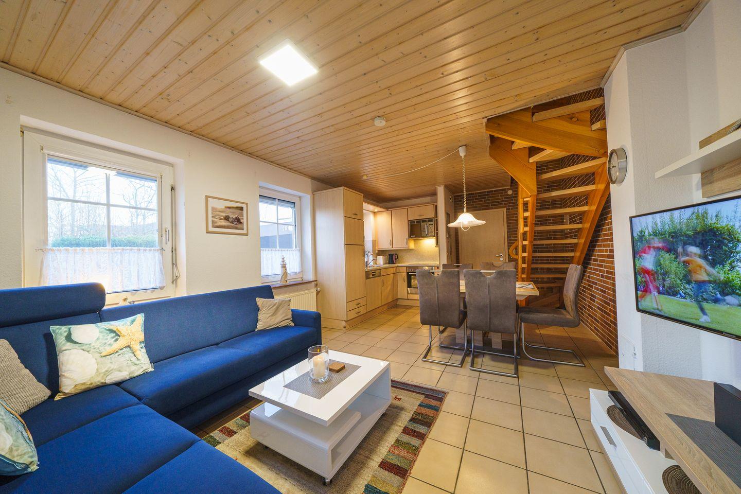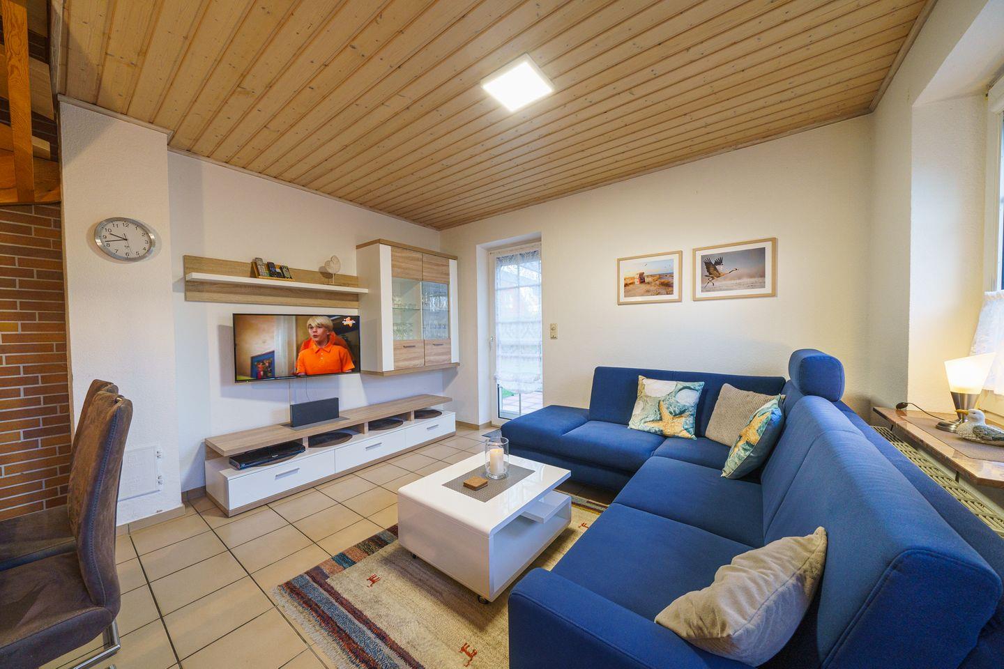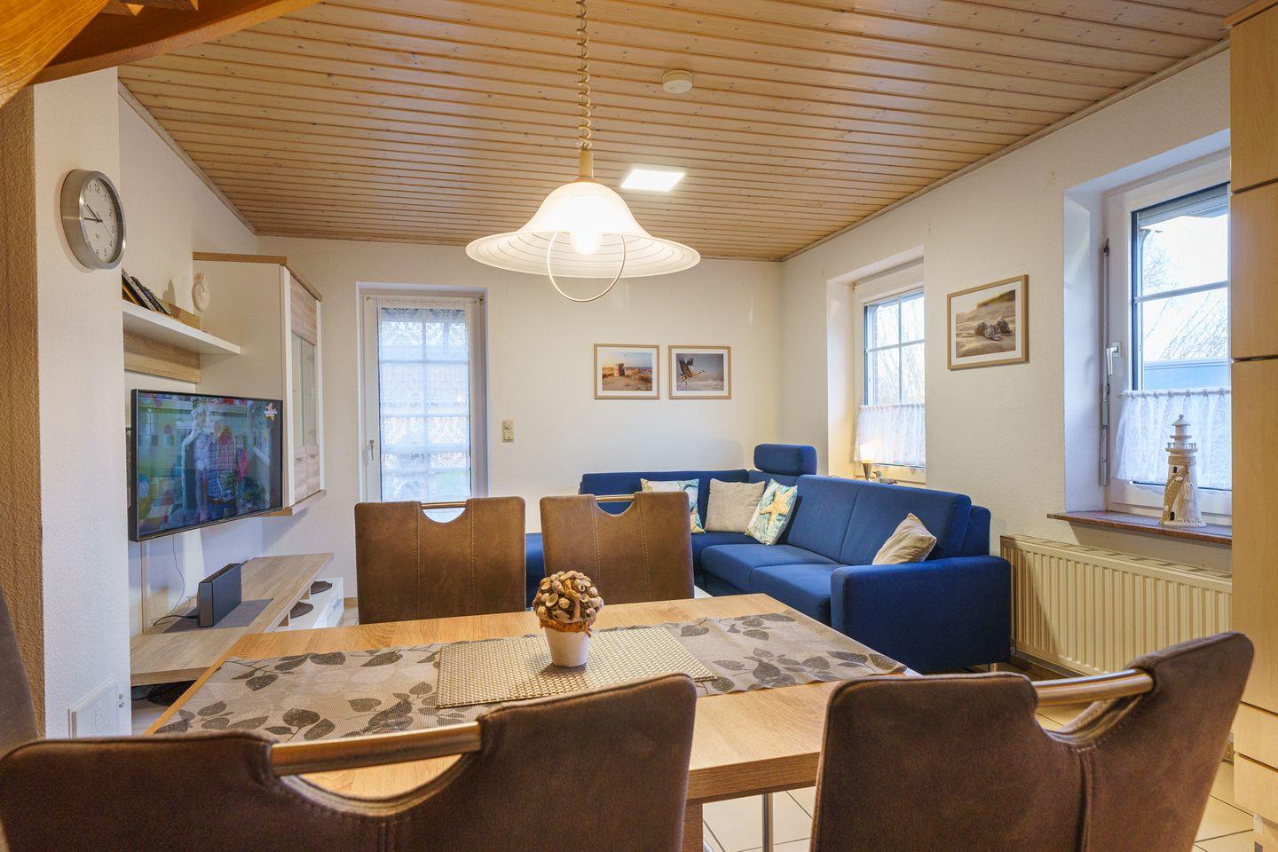 Für gesellige Abende bietet das helle Wohnzimmer eine einladende Sofaecke, ideal für entspannte Filmabende mit dem vorhandenen TV und DVD-Spieler. Zwei Fernseher sorgen dafür, dass jeder seinen Lieblingsfilm genießen kann. WLAN ist selbstverständlich vorhanden, sodass Sie auch während Ihres Urlaubs im Internet surfen können.