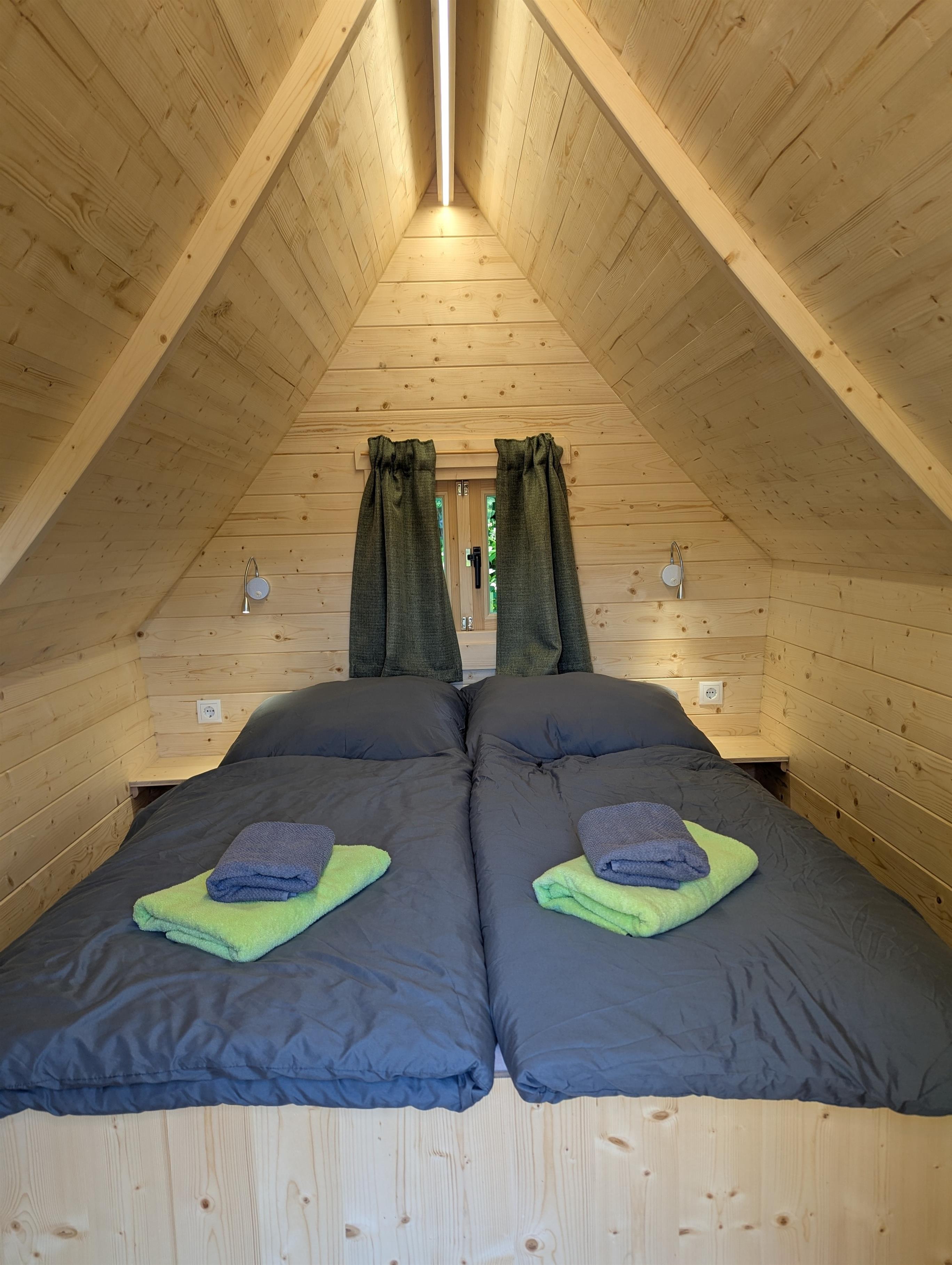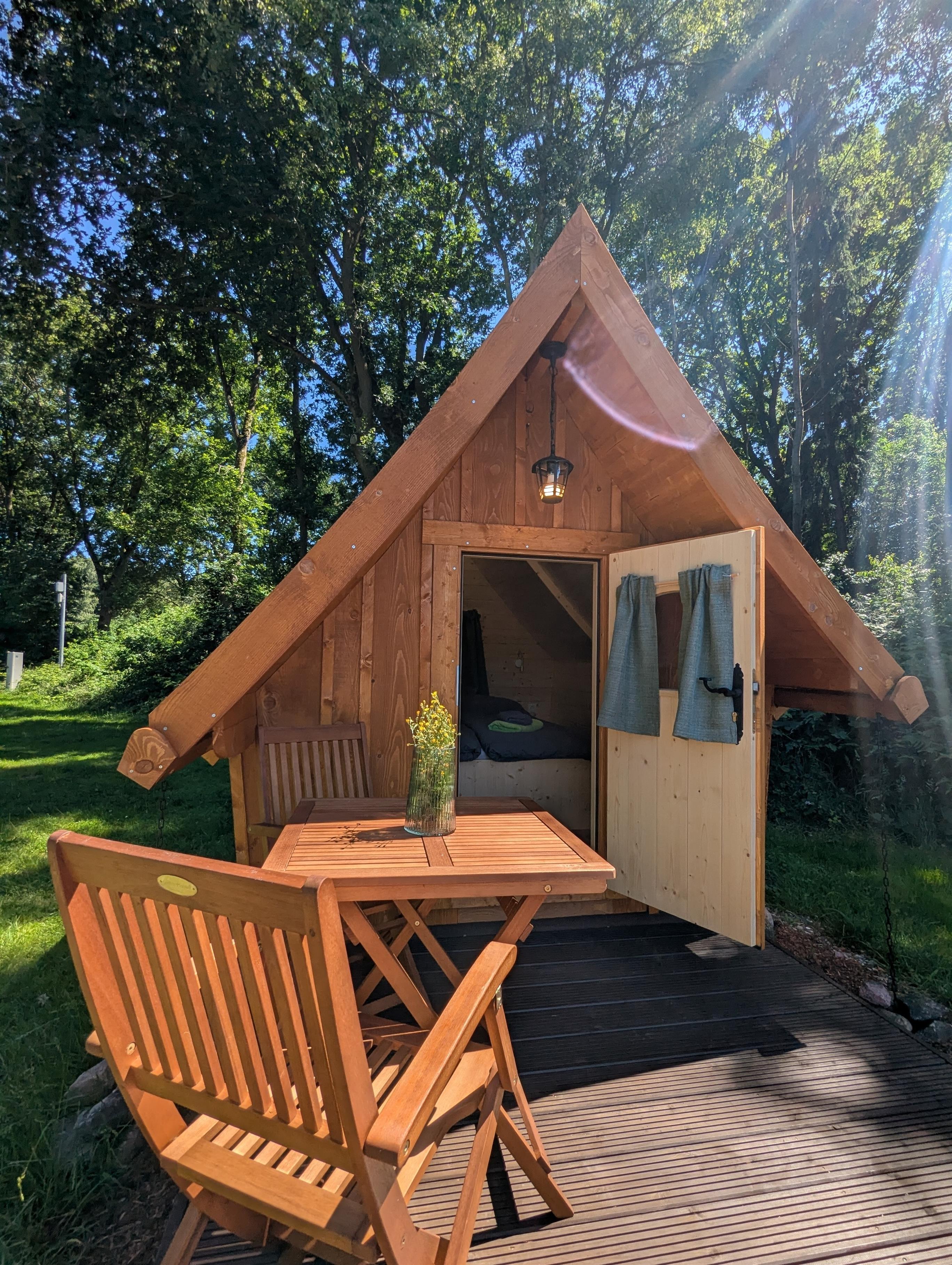 Auf 11 qm finden sie eine einfache aber komfortable Ausstattung mit Doppelbett und Schrank. Die Sanitäranlagen des Campingplatzes sind ca. 100 m entfernt und können kostenfrei mit genutzt werden.