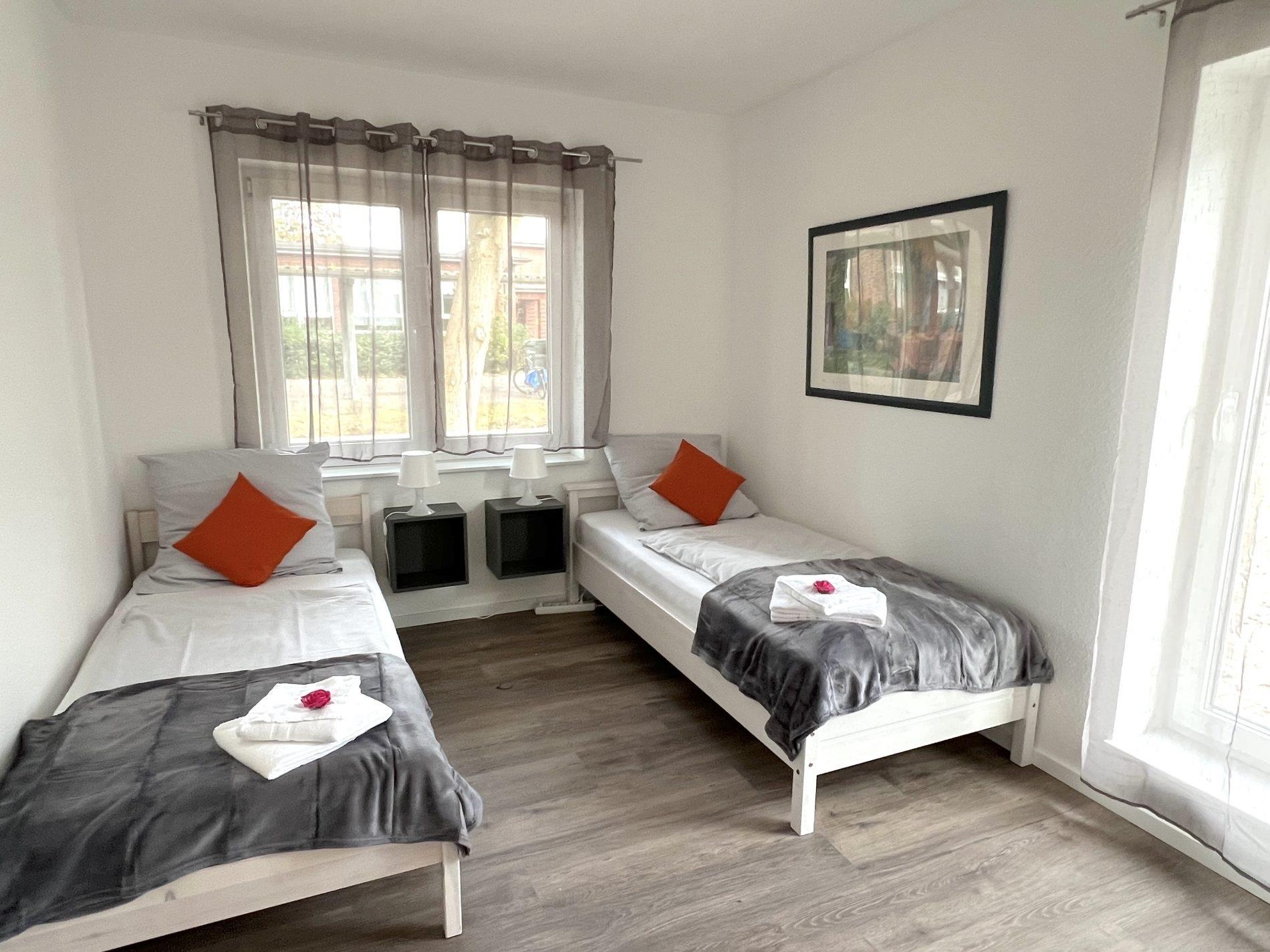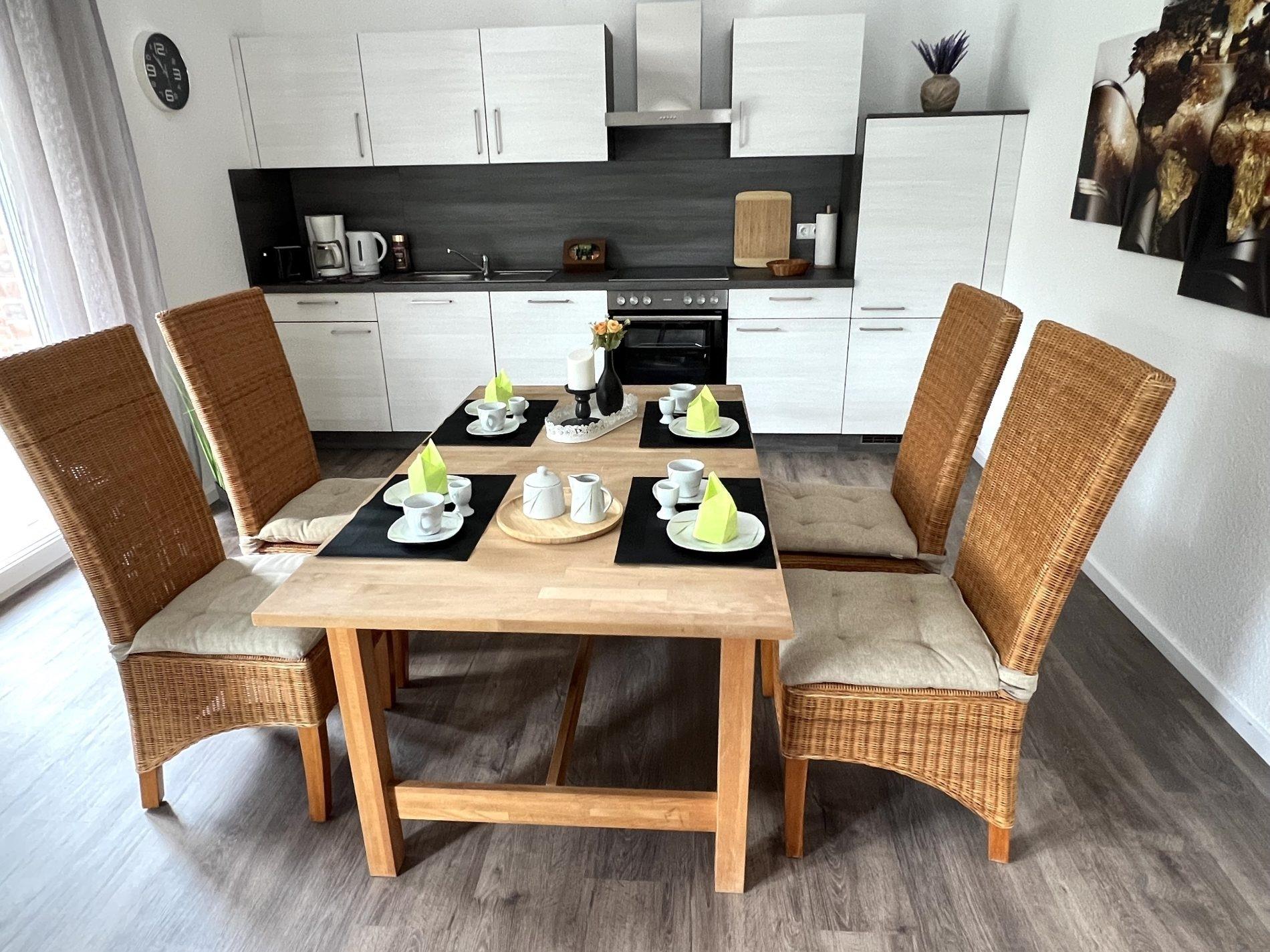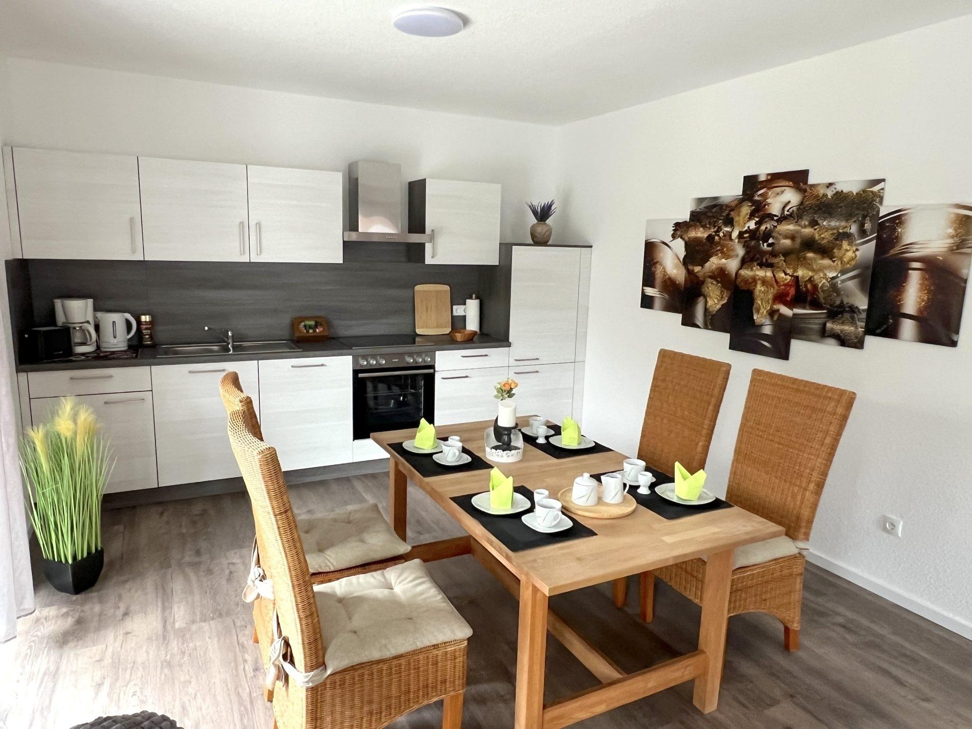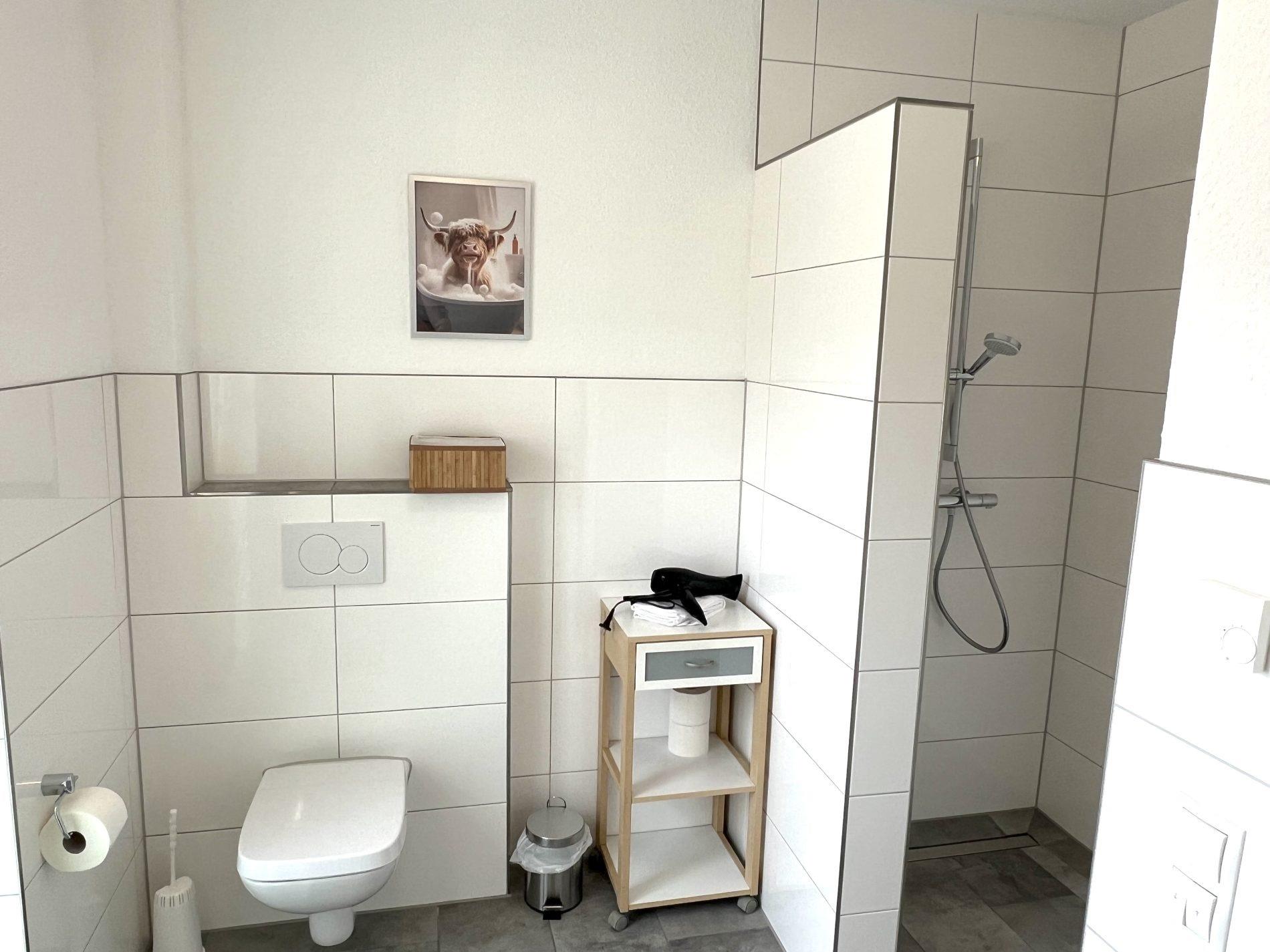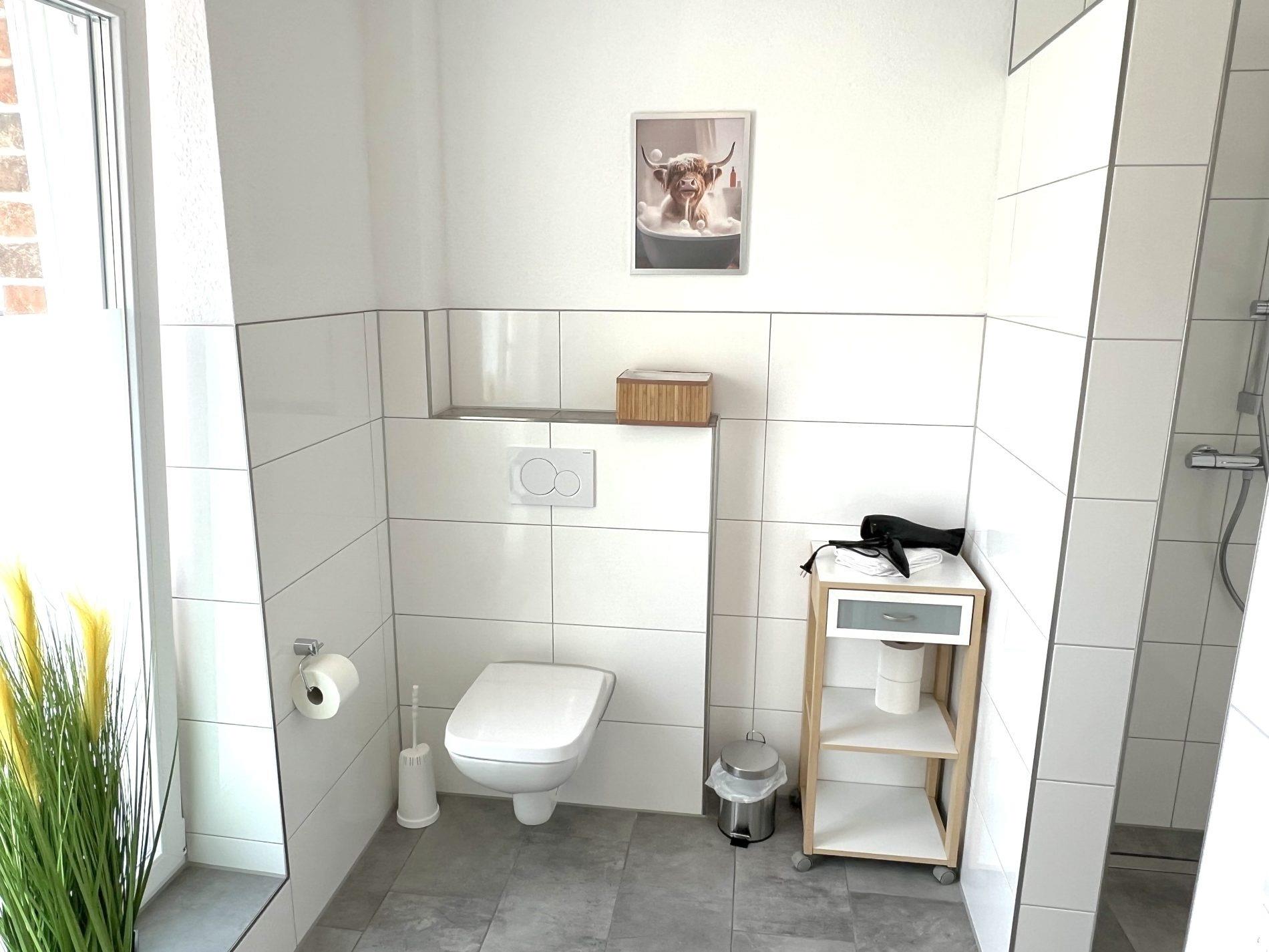 Hier fühlen Sie sich wie zuhause. Die Unterkunft ist modern und hell ausgestattet. Hier ist Platz für die ganze Familie. Es handelt sich um ein Mehrfamilienhaus mit 4 Wohneinheiten. Das Haus wurde 2023/2024 nach den neuesten Bauvorschriften im KfW 55 Standard erbaut. Die Wohnungen werden über Wärmepumpen beheizt. Die voll ausgestattete Wohnung verfügt über 2 Schlafzimmer mit jeweils 2 Einzelbetten. Im Wohn-, Küchenraum wurde eine voll eingerichtete neue Einbauküche mit Spülmaschine, Backofen, Herd, Kühlschrank mit Gefrierfach, Mikrowelle usw. eingebaut. Kaffeemaschine und Wasserkocher gehören ebenso zur Ausstattung wie Toaster und Eierkocher. Der Wohnraum ist mit einem großen Flachbild-TV ausgestattet. Kostenloses Wlan ist selbstverständlich. Das geräumige Badezimmer mit ebenerdiger begehbarer Dusche lässt keine Wünsche offen. Für längere Aufenthalte befindet sich entsprechendes Equipment wie Waschmaschine, Bügelbrett und Bügeleisen im Abstellraum. Handtücher, Bettwäsche, Duschgel, Shampoo usw. steht Ihnen kostenlos zur Verfügung. In den Sommermonaten stehen ein Grill sowie Gartenmöbel mit Sonnenschirm auf der überdachten Terrasse bereit. Ein kostenloser Parkplatz befindet direkt am Haus. Es ist an alles gedacht.