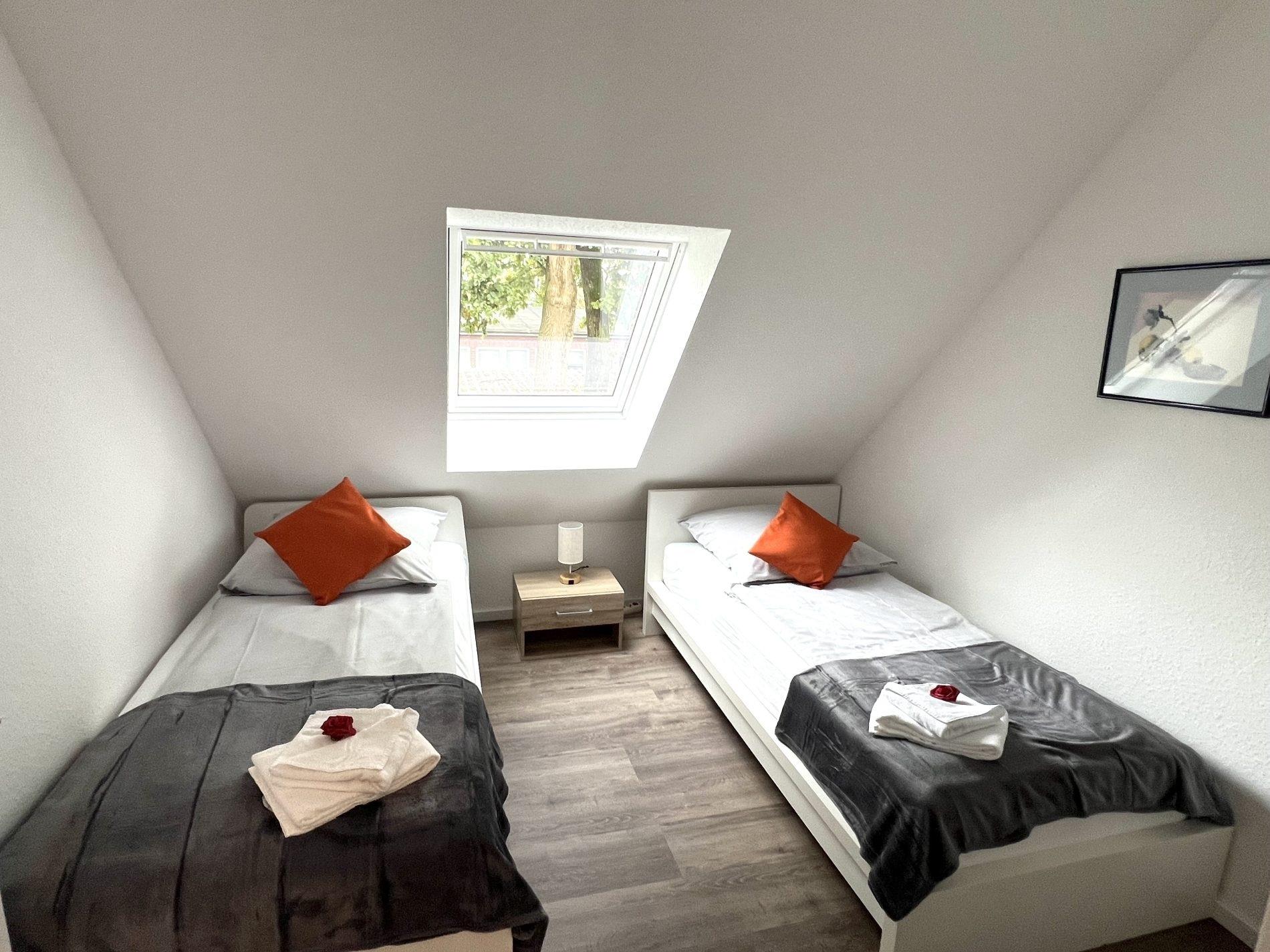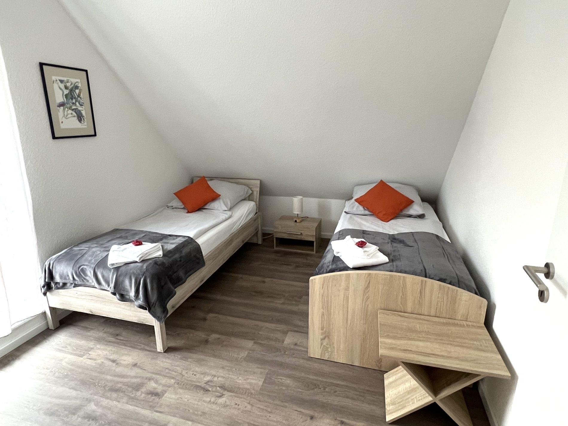Wir bieten unseren Gästen eine komplett eingerichtete 73 qm große Ferienwohnung. Diese Wohnung befindet sich im DG und ist über eine Treppe zu erreichen. Hier fühlen Sie sich wie zuhause. Die Unterkunft ist modern und hell ausgestattet. Hier ist Platz für die ganze Familie. Es handelt sich um ein Mehrfamilienhaus mit 4 Wohneinheiten. Das Haus wurde 2023/2024 nach den neuesten Bauvorschriften im KfW 55 Standard erbaut. Die Wohnungen werden über Wärmepumpen beheizt. Die voll ausgestattete Wohnung verfügt über 2 Schlafzimmer mit jeweils 2 Einzelbetten. Im Wohn-, Küchenraum wurde eine voll eingerichtete neue Einbauküche mit Spülmaschine, Backofen, Herd, Kühlschrank mit Gefrierfach, Mikrowelle usw. eingebaut. Kaffeemaschine und Wasserkocher gehören ebenso zur Ausstattung wie Toaster und Eierkocher. Der Wohnraum ist mit einem großen Flachbild-TV ausgestattet. Kostenloses Wlan ist selbstverständlich. Das geräumige Badezimmer mit ebenerdiger begehbarer Dusche lässt keine Wünsche offen. Für längere Aufenthalte befindet sich entsprechendes Equipment wie Waschmaschine, Bügelbrett und Bügeleisen im Abstellraum. Handtücher, Bettwäsche, Duschgel, Shampoo usw. steht Ihnen kostenlos zur Verfügung. In den Sommermonaten stehen ein Grill sowie Gartenmöbel mit Sonnenschirm auf der großen Dachterrasse bereit. Ein kostenloser Parkplatz befindet direkt am Haus. Es ist an alles gedacht.