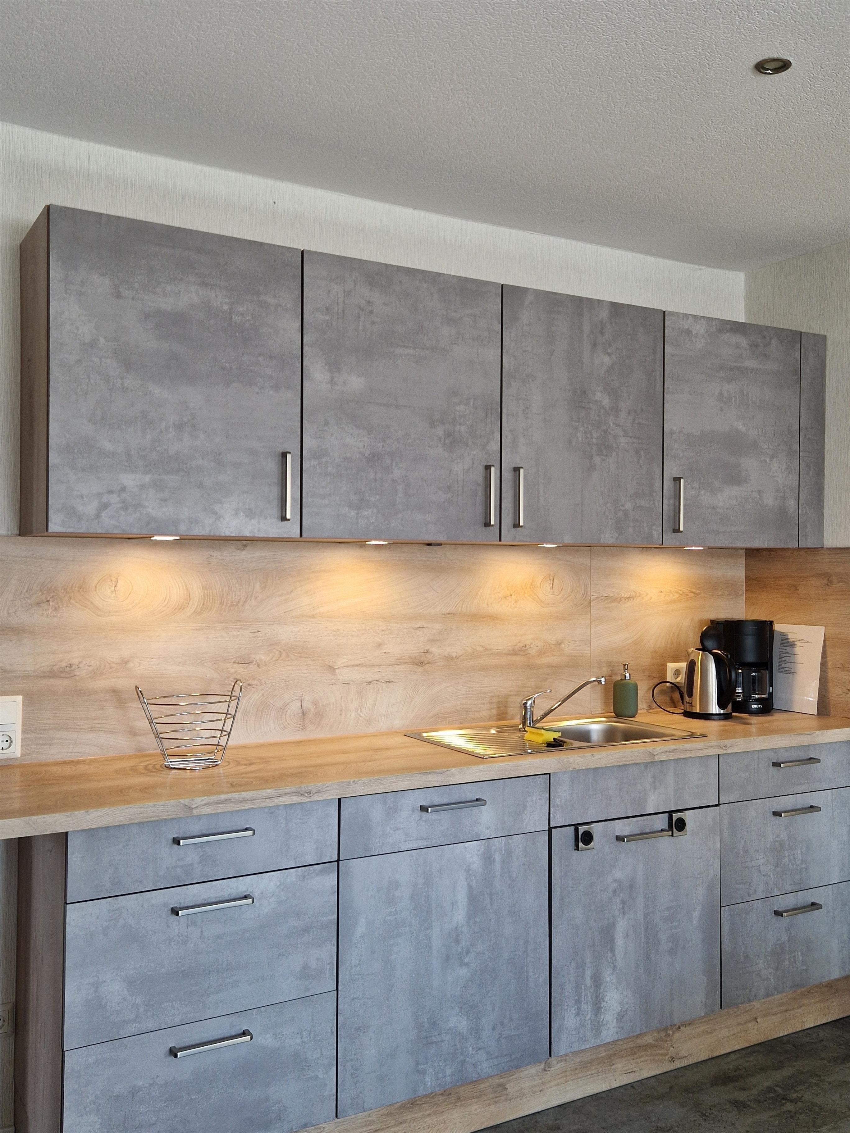 Die Küche ist komplett ausgestattet mit Spülmaschine, Backofen, Mikrowelle, Toaster, Wasserkocher, Kaffeemaschine, Kühlschrank mit 0-Grad-Zone.