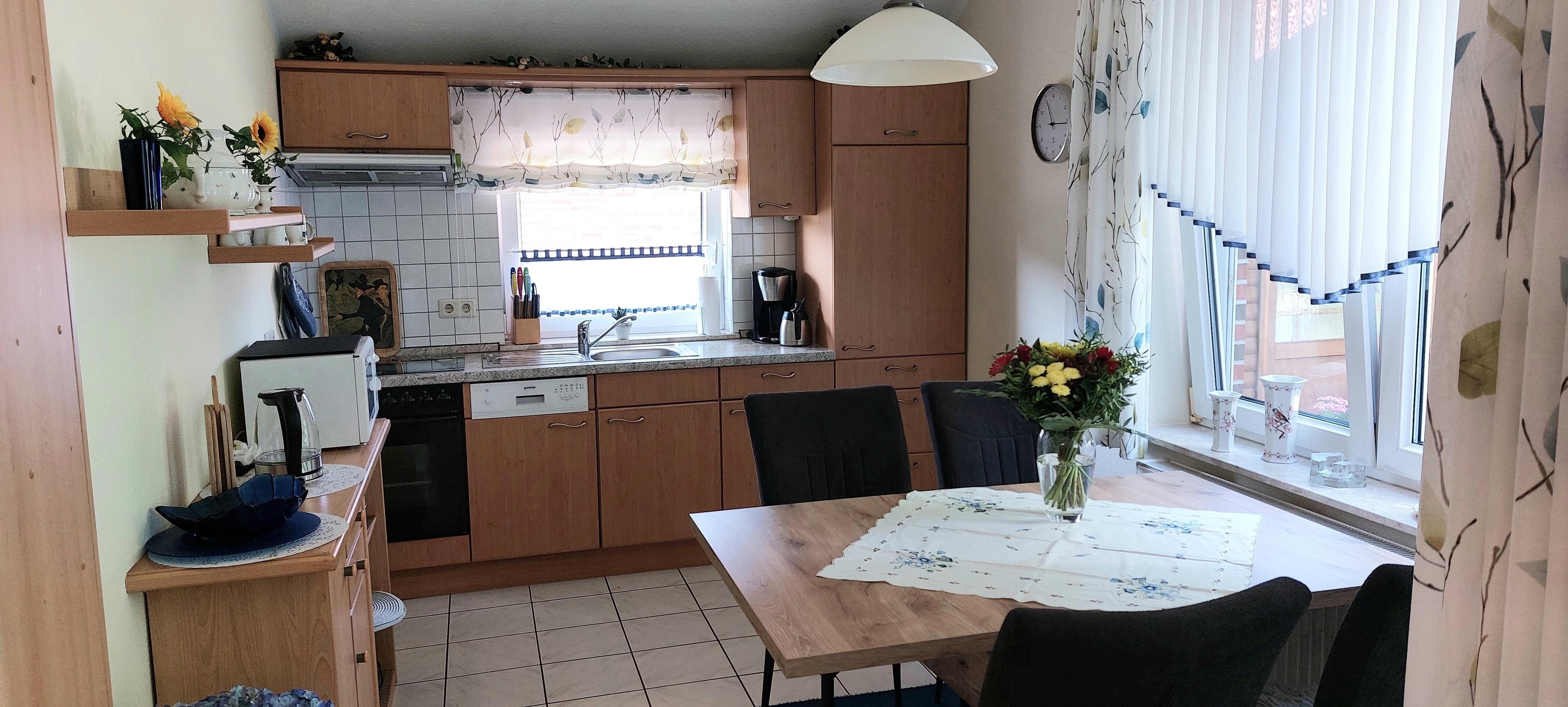 Im Küchen- und Badbereich mit: Spülmaschine; Waschmaschine; Kühlschrank mit Gefrierfach; Herd; Mikrowelle; Kaffeemaschine; Wasserkocher; Eierkocher; Toaster; Mixer und reichhaltigem Geschirr und Gläsern sowie Fön; Bügeleisen und Bügelbrett.