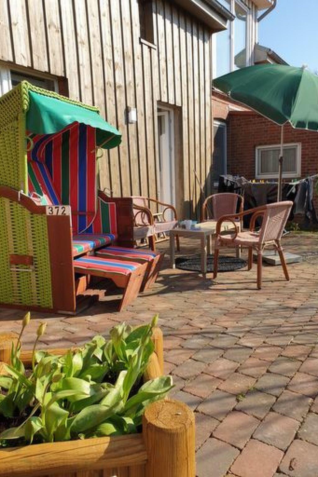 Der Außenbereich besticht durch eine eigene Terrasse, die mit komfortablen Gartenmöbeln, Strandkorb und Liegen ausgestattet ist. Hier können Sie den Blick über weite Wiesen und Felder, bevölkert mit Schafen und Pferden, bis hin zum 1 km entfernten Deich schweifen lassen.