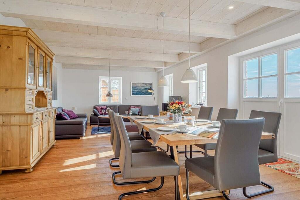 Genießen Sie vom über 40qm großen offenen Wohn-Eßbereich den herrlichen Blick in die Insel. Oder gehen Sie durch die große Verandatür direkt nach draußen in die Natur. Die perfekt eingerichtete Küche und der große Eßplatz lassen jede Mahlzeit zu einem kleinen Fest werden. Auch bei Schietwetter wird es mit Smart TV und schnellem Internet nicht langweilig. In der kalten Jahreszeit entspannen Sie in der hauseigenen Sauna oder lassen sich von der wohligen Wärme des prachtvollen Kachelofen verwöhnen. Eine Fußbodenheizung im ganzen Haus sorgt für gleichmäßige Wärme. Die beiden Schlafzimmer im Obergeschoss sind mit Bad en Suite, ein Schlafzimmer liegt seniorengerecht im Erdgeschoss mit dem Bad direkt gegenüber. Luxuriöse Boxspringbetten sorgen für guten Schlaf.