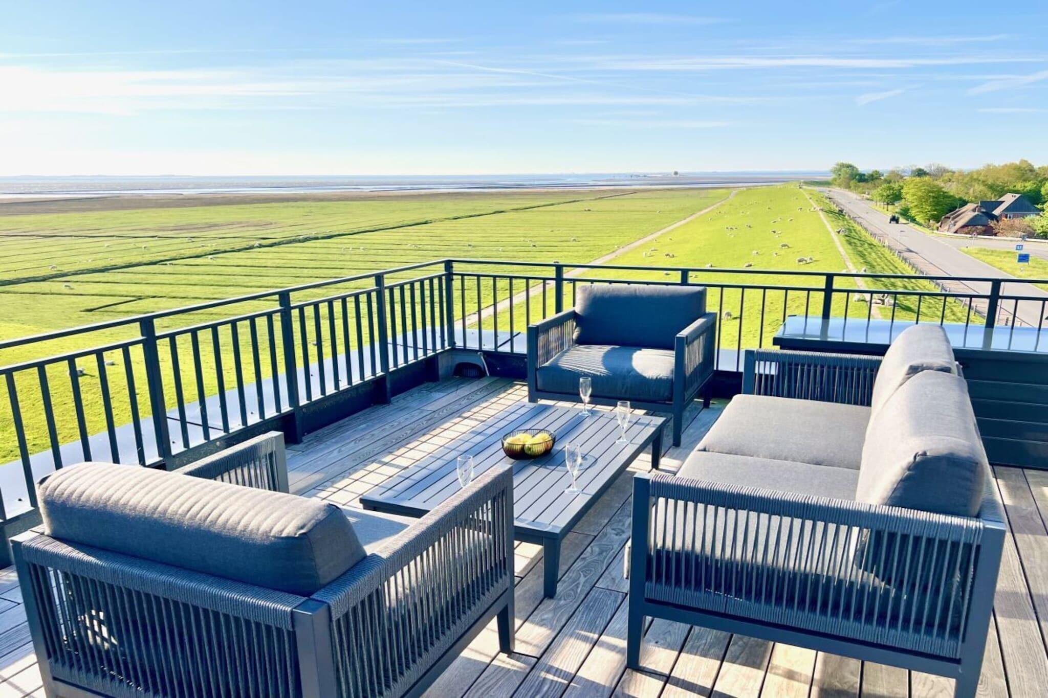 Erleben Sie im Penthouse auf Pellworm einen atemberaubenden Panoramablick und entspannen Sie auf der großen Dachterrasse mit Sauna.