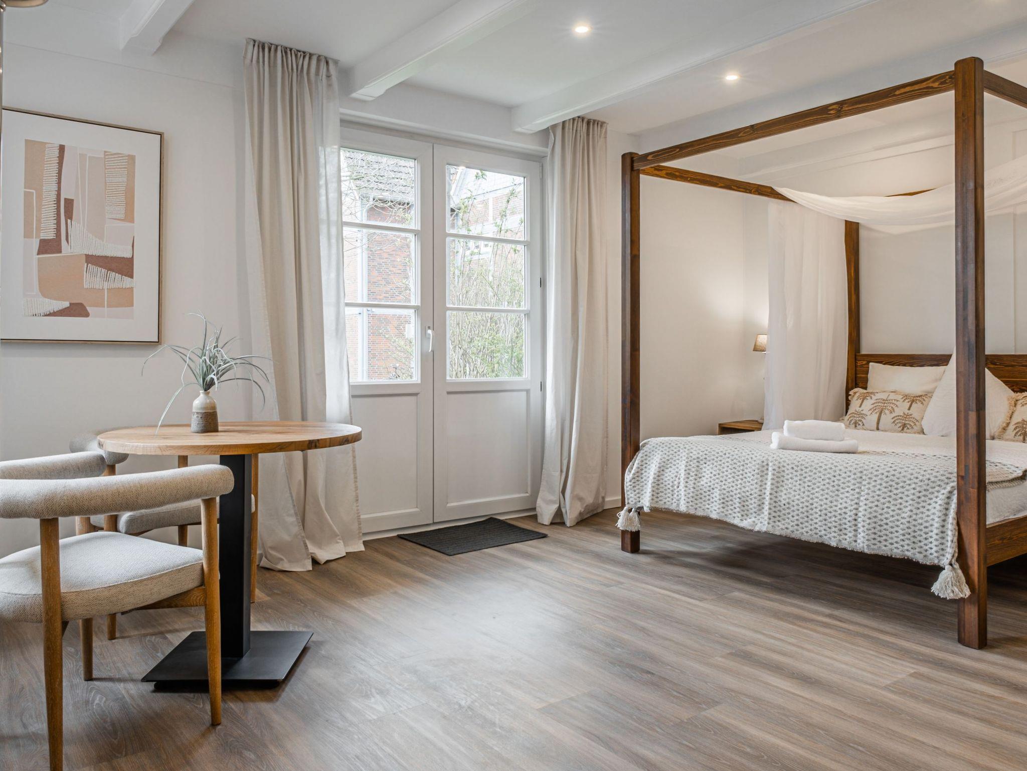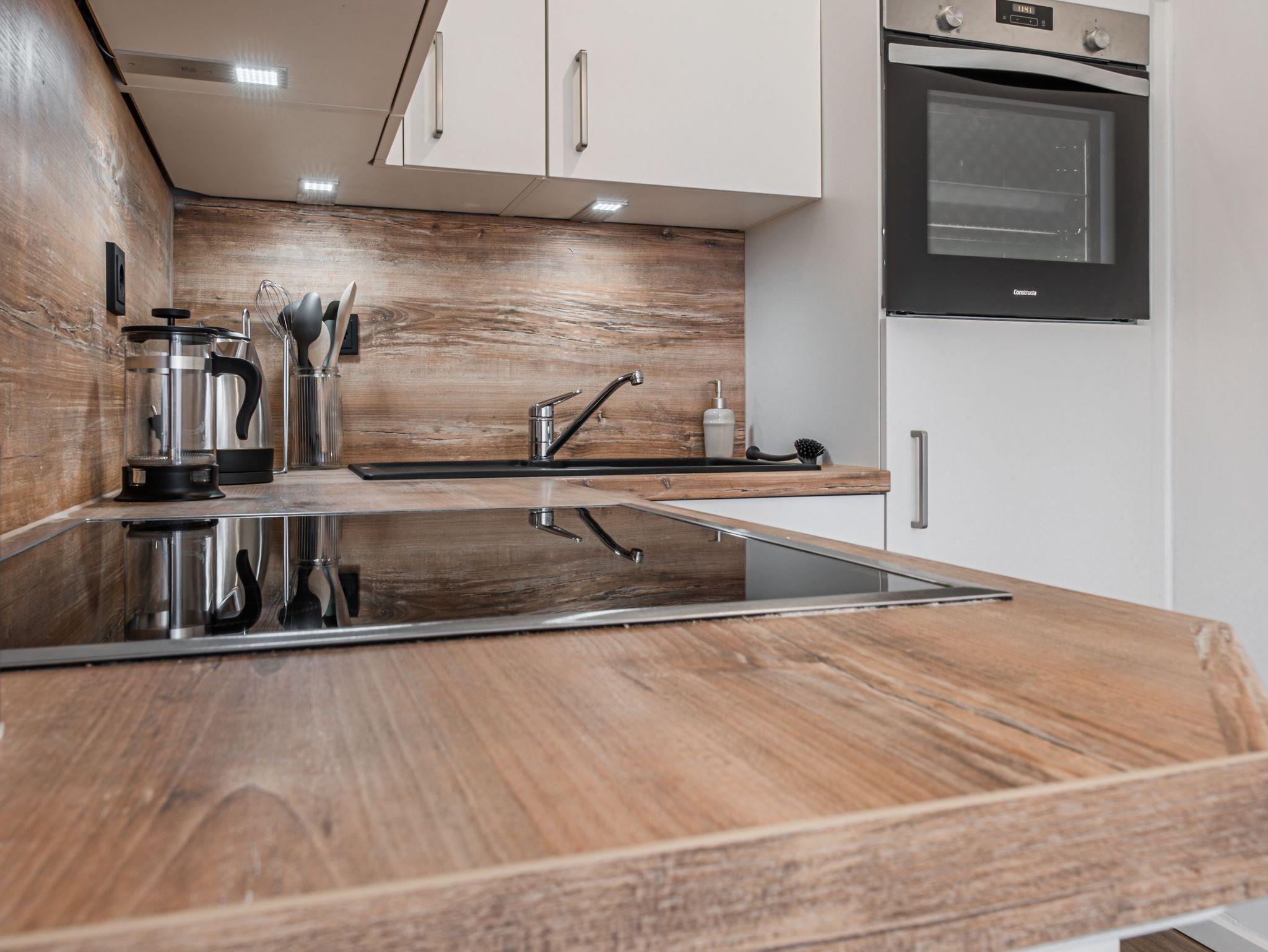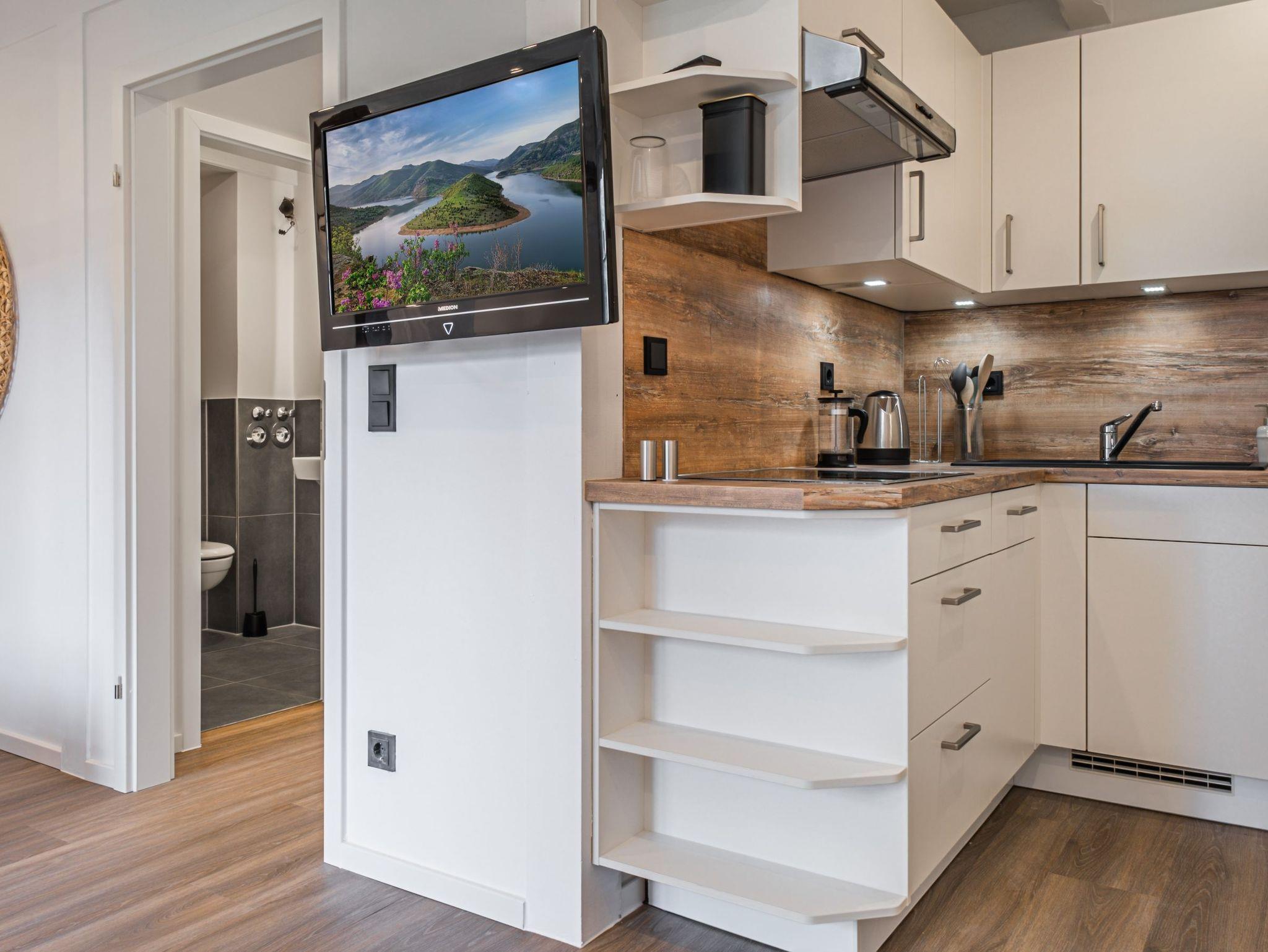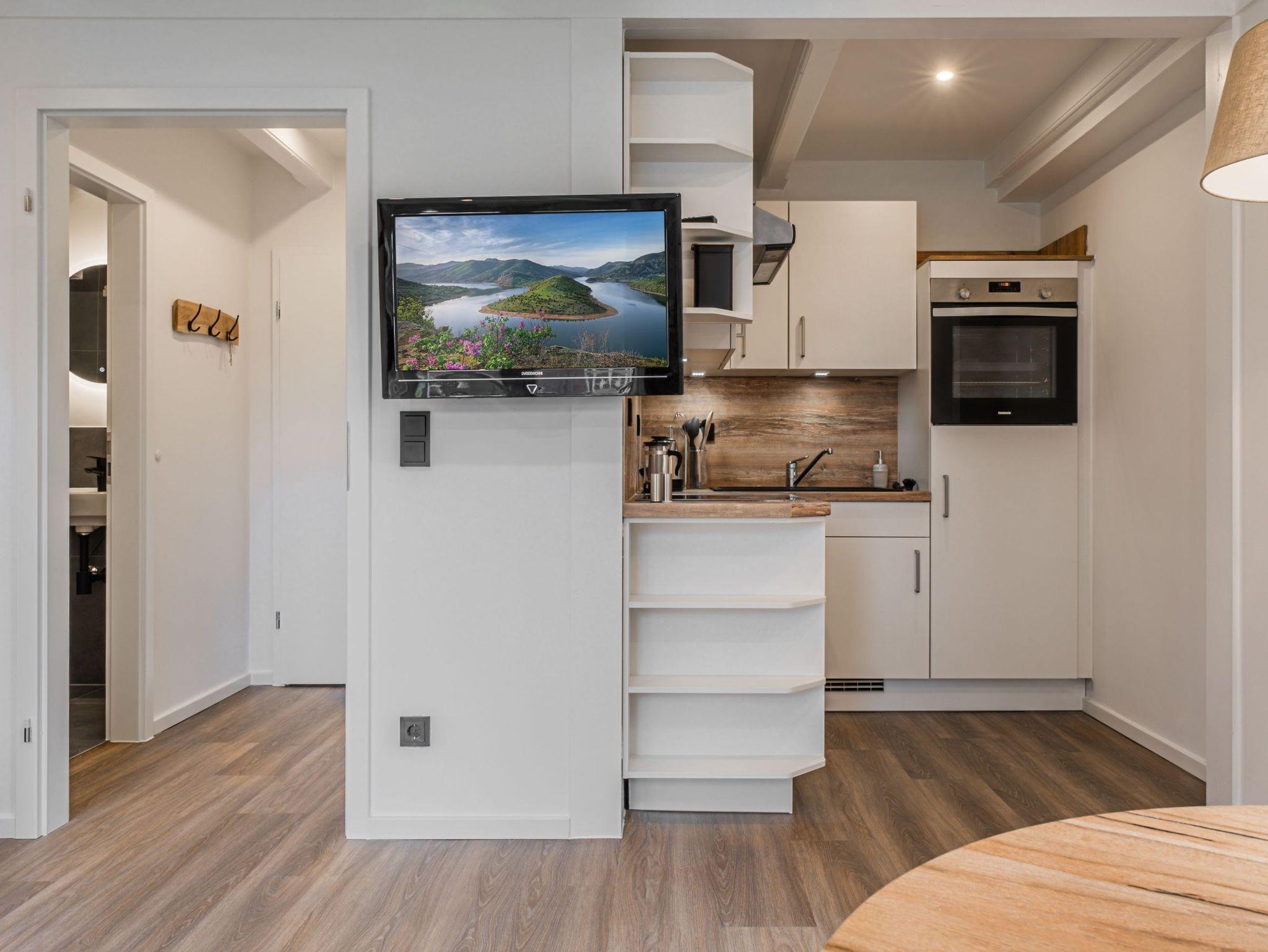 Im Wohnraum befindet sich ein Doppelbett (Platz für 2 Personen), die Küchenzeile aus dem Jahr 2022 ist mit einem 4 Platten Cerankochfeld, einem Backofen, einem Kühlschrank, einem Geschirrspüler, einer Kaffeemaschine, einem Toaster und einem Wasserkocher ausgestattet. Ein Esstisch sowie ein Fernseher mit SAT-Anschluss gehören ebenfalls dazu. WLAN ist in der Wohnung vorhanden.