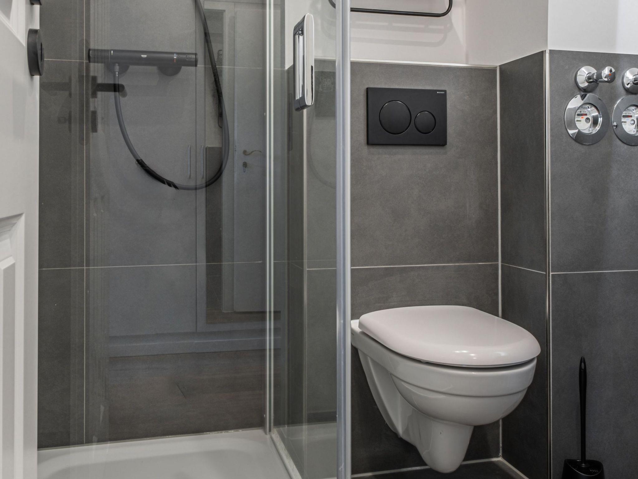 Das Badezimmer ist mit einer Dusche, einem WC und einem Fön ausgestattet. Eine eigene Terrasse gehört zur Wohnung und am Haus befindet sich zusätzlich eine Liegewiese, die von allen Gästen genutzt werden können.