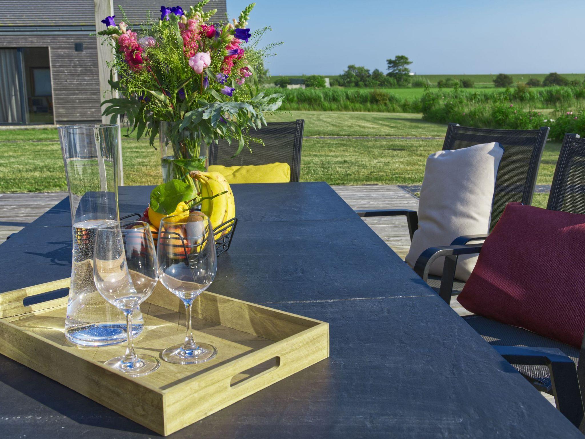 Ihre Mahlzeiten können Sie auch ganz in Ruhe auf der großen Terrassenfläche einnehmen. Ein Terrassentisch und 8 Stühle sind dafür vorhanden. Drei Liegen laden zum ausgiebigen Sonnenbaden ein. Der Garten bietet viel Erholungs- und Spielfläche. Auch in den kühleren Monaten ergänzen sich Natur und Haus perfekt. Machen Sie es sich nach ausgiebigen Deichwanderungen in frischer Meeresluft einfach in der Sauna oder auf dem Sofa gemütlich oder geben Sie sich dem hin, was hier am besten funktioniert: dem gepflegten Nichtstun!