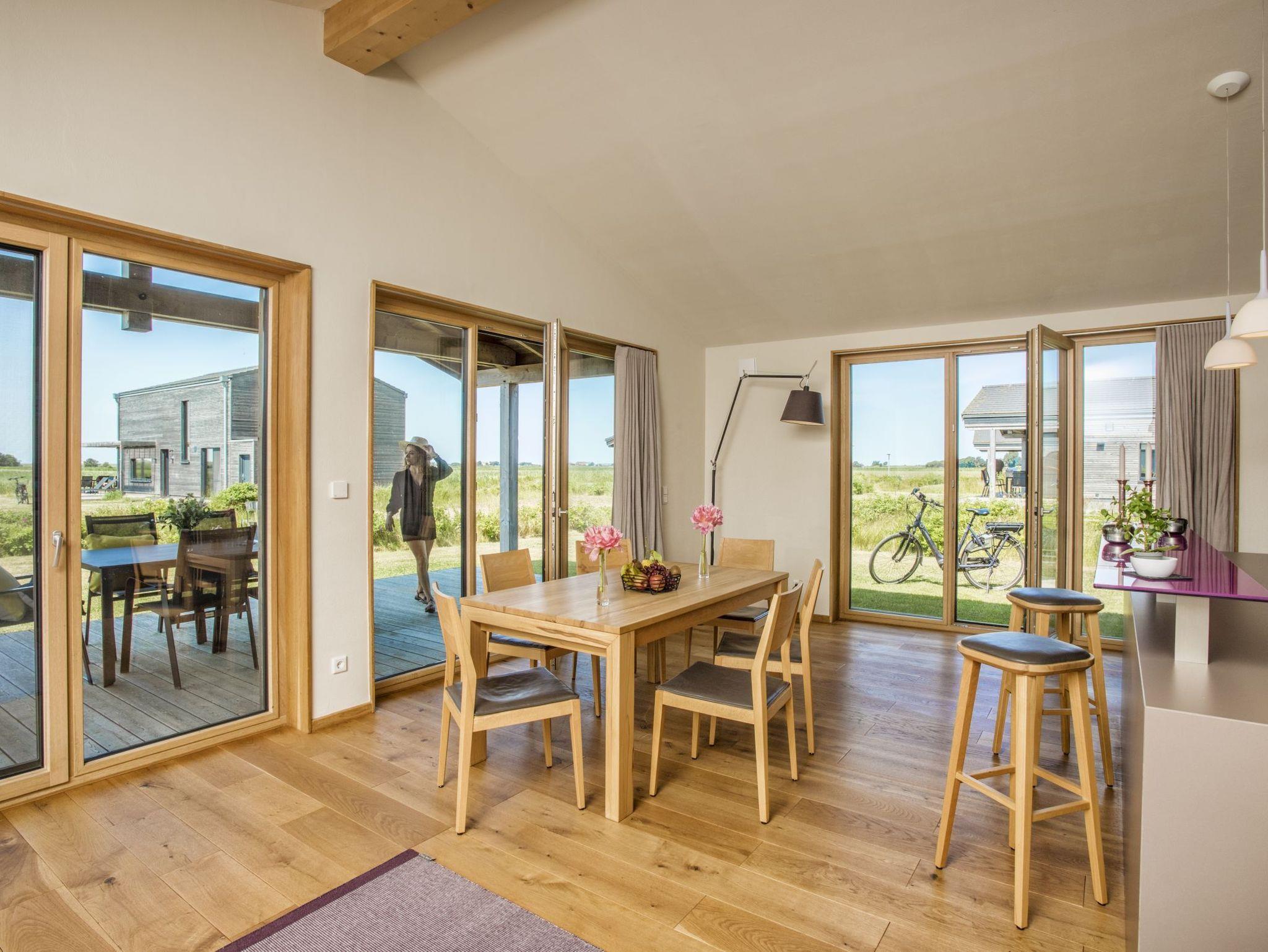 Ihre Mahlzeiten können Sie ganz in Ruhe auf einer der großen Terrassenflächen (teilweise überdacht) einnehmen. Ein Terrassentisch und 6 Stühle sind dafür vorhanden. Zwei Liegen laden auf der Sonnenterrasse zum ausgiebigen Sonnenbaden ein. Der Garten bietet viel Erholungs- und Spielfläche. Auch in den kühleren Monaten ergänzen sich Natur und Haus perfekt. Machen Sie es sich nach ausgiebigen Deichwanderungen in frischer Meeresluft einfach mit einem guten Buch in der Sauna oder auf dem Sofa gemütlich oder geben Sie sich dem hin, was hier am besten funktioniert: dem gepflegten Nichtstun!