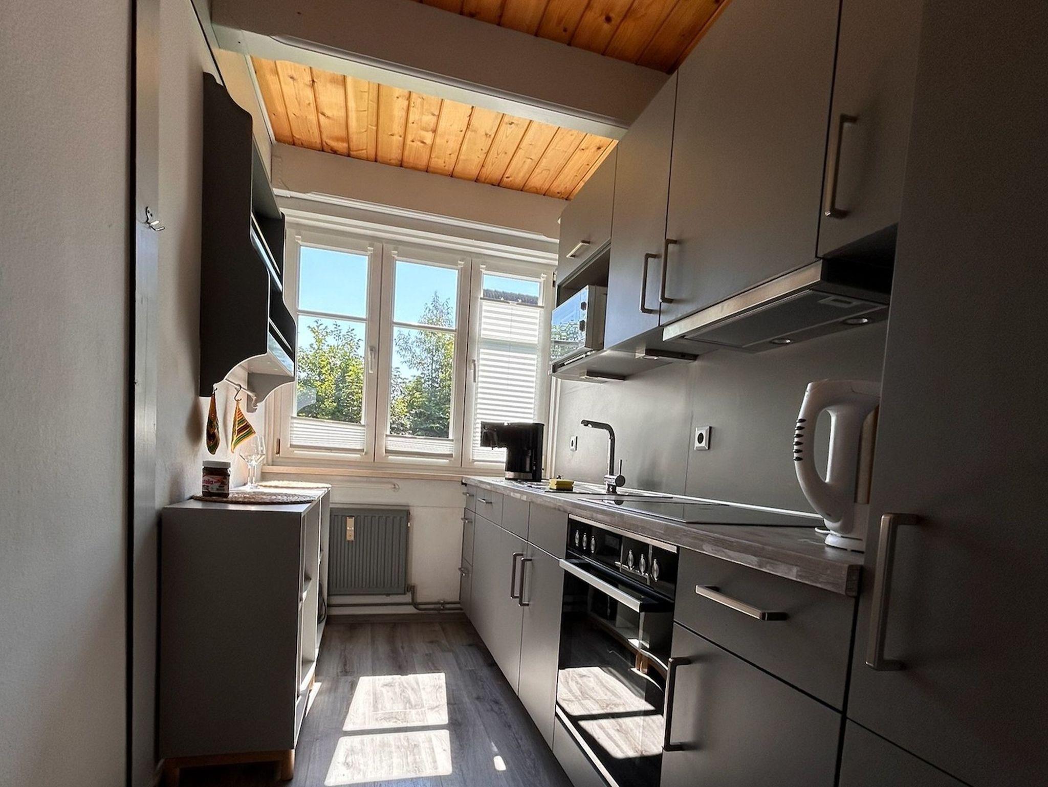 Die seperate neue Küche ist mit einem 4 Platten Cerankochfeld, einem Backofen, einer Mikrowelle, einem Kühlschrank, einer Kaffeemaschine, einem Toaster und einem Wasserkocher sowie einem Geschirrspüler voll ausgestattet. WLAN ist vorhanden.
