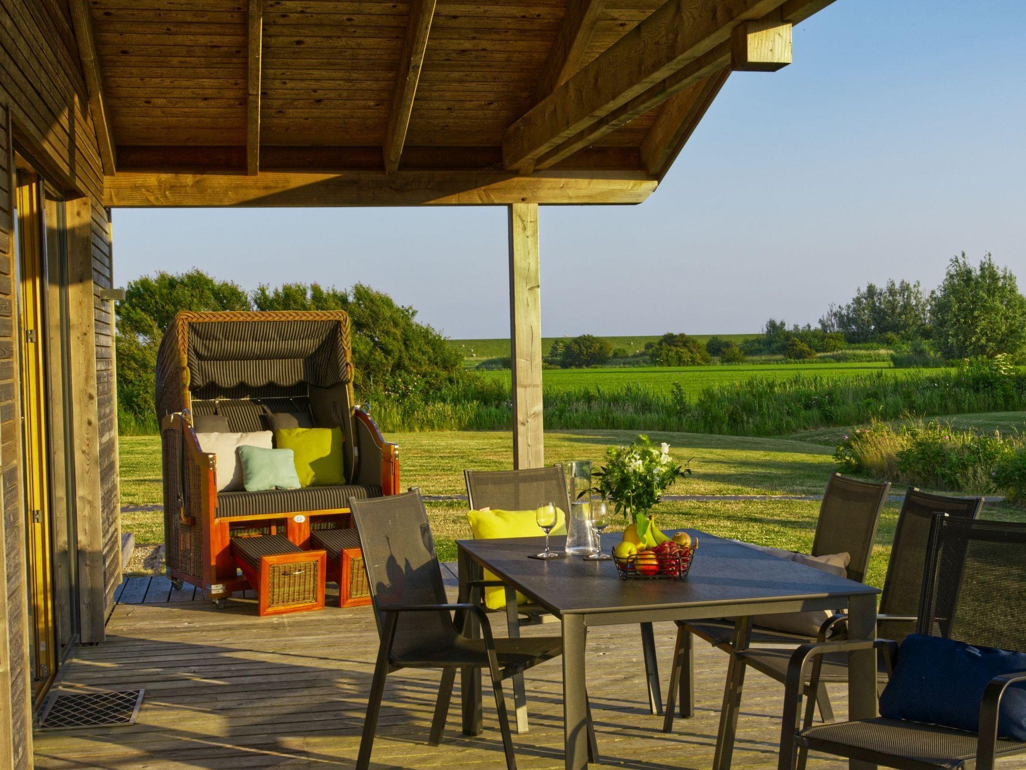 Ihre Mahlzeiten können Sie ganz in Ruhe auf einer der großen Terrassenflächen (teilweise überdacht) einnehmen. Ein Terrassentisch und 6 Stühle sind dafür vorhanden. Zwei Liegen laden auf der Sonnenterrasse zum ausgiebigen Sonnenbaden ein. Der Garten bietet viel Erholungs- und Spielfläche. Auch in den kühleren Monaten ergänzen sich Natur und Haus perfekt. Machen Sie es sich nach ausgiebigen Deichwanderungen in frischer Meeresluft einfach mit einem guten Buch in der Sauna oder auf dem Sofa gemütlich oder geben Sie sich dem hin, was hier am besten funktioniert: dem gepflegten Nichtstun!