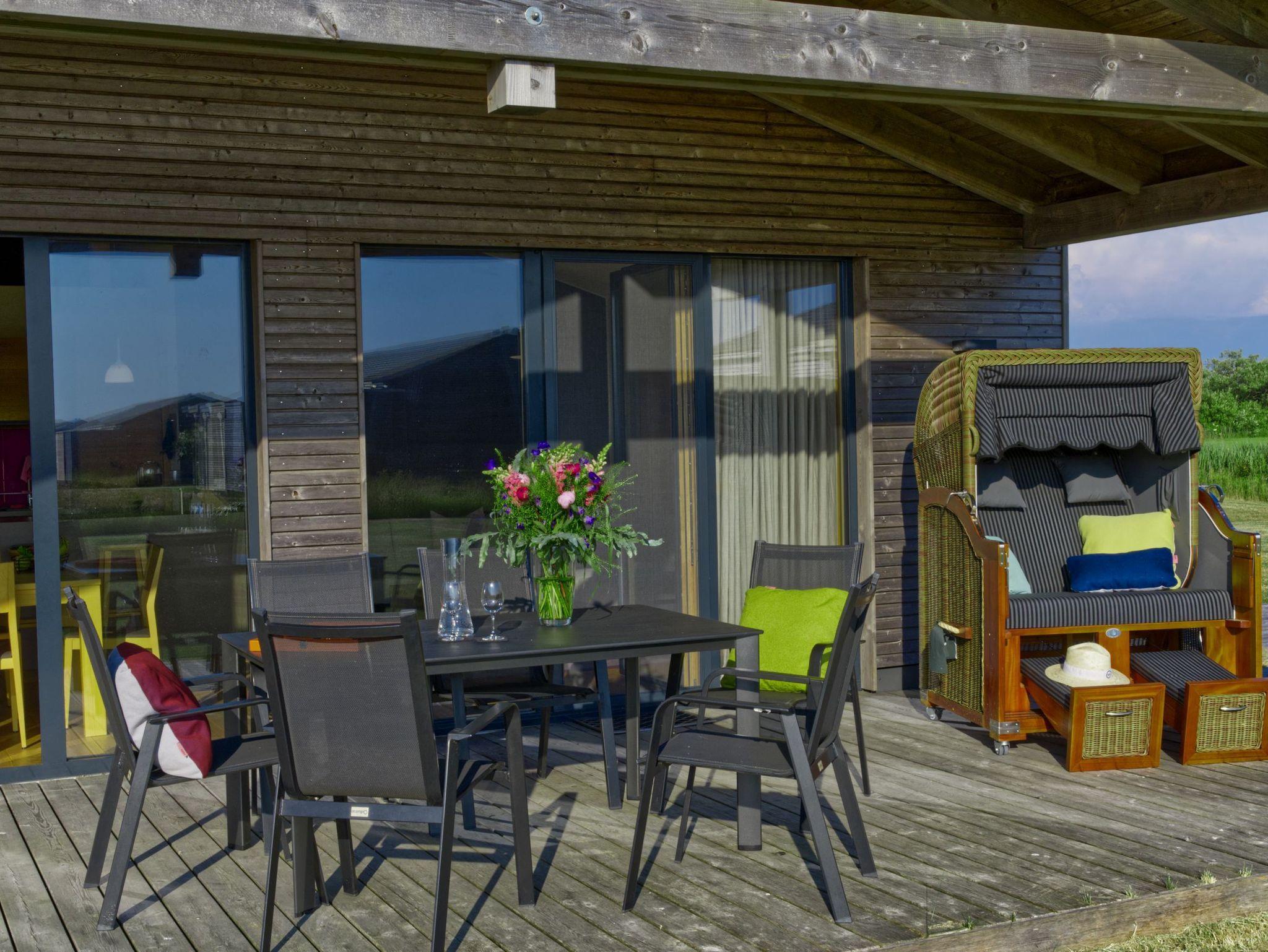 Ihre Mahlzeiten können Sie ganz in Ruhe auf einer der großen Terrassenflächen (teilweise überdacht) einnehmen. Ein Terrassentisch und 6 Stühle sind dafür vorhanden. Zwei Liegen laden auf der Sonnenterrasse zum ausgiebigen Sonnenbaden ein. Der Garten bietet viel Erholungs- und Spielfläche. Auch in den kühleren Monaten ergänzen sich Natur und Haus perfekt. Machen Sie es sich nach ausgiebigen Deichwanderungen in frischer Meeresluft einfach mit einem guten Buch in der Sauna oder auf dem Sofa gemütlich oder geben Sie sich dem hin, was hier am besten funktioniert: dem gepflegten Nichtstun!