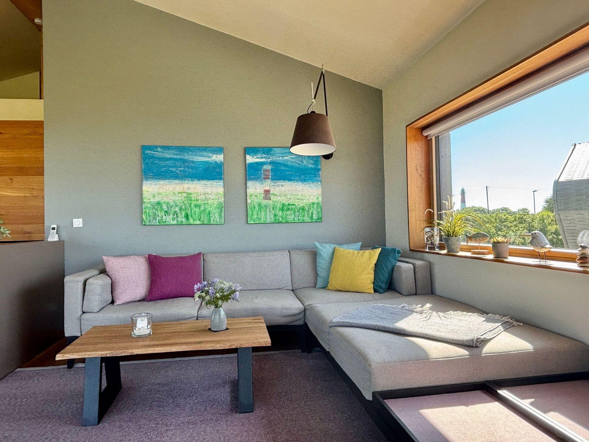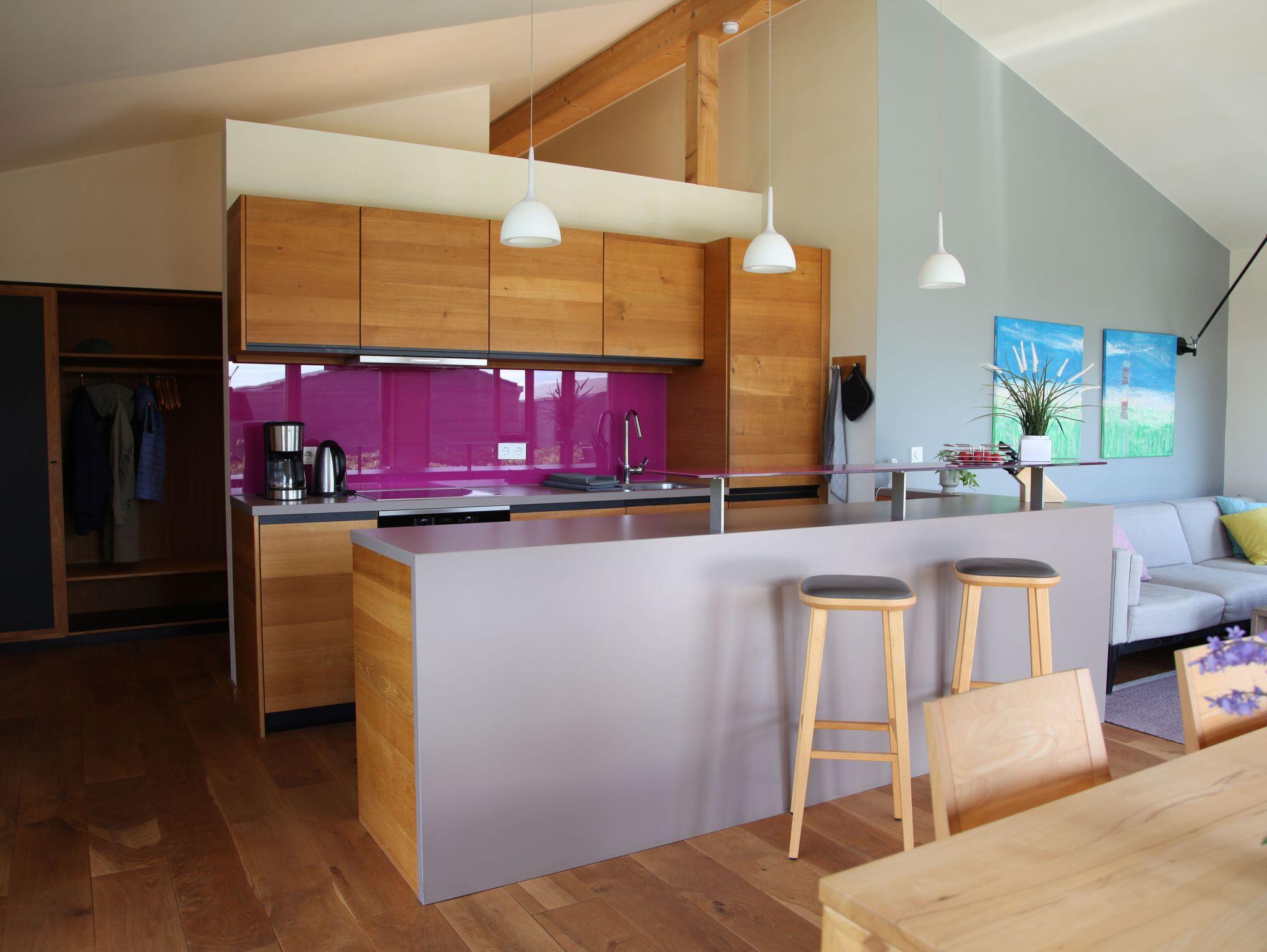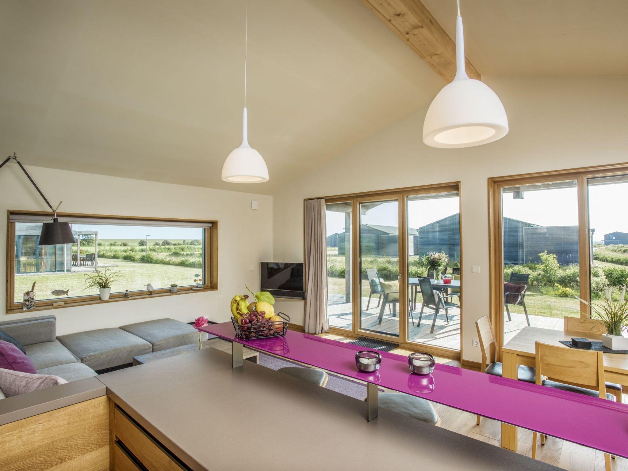 Der großzügige Wohnraum (40 m²) mit Essbereich, offener Küche und Tresen verfügt über einen 40“-TV mit SONOS Soundbar. Die Soundanlage kann über Ihr Smartphone mittels SONOS-App gesteuert werden. Die zwei Schlafzimmer verfügen jeweils über ein Doppelbett (160x200) und einen großen Einbauschrank. Bei Bedarf kann ein Zustellbett (80x200, gegen Gebühr) ergänzt werden. Ein Schlafraum ist mit einem 32“-TV ausgestattet. Alle Küchengeräte wie Induktionsherd, Spülmaschine und Kühlschrank mit 4-Sterne-Gefrierfach sowie Waschmaschine und Trockner stammen aus dem Hause Miele. Dank eines hochmodernen Glasfaseranschlusses (250 MBit) ist eine leistungsstarke Internetverbindung vorhanden (z.B. für Streaming). Das WLAN im Haus kann auf Wunsch deaktiviert werden.