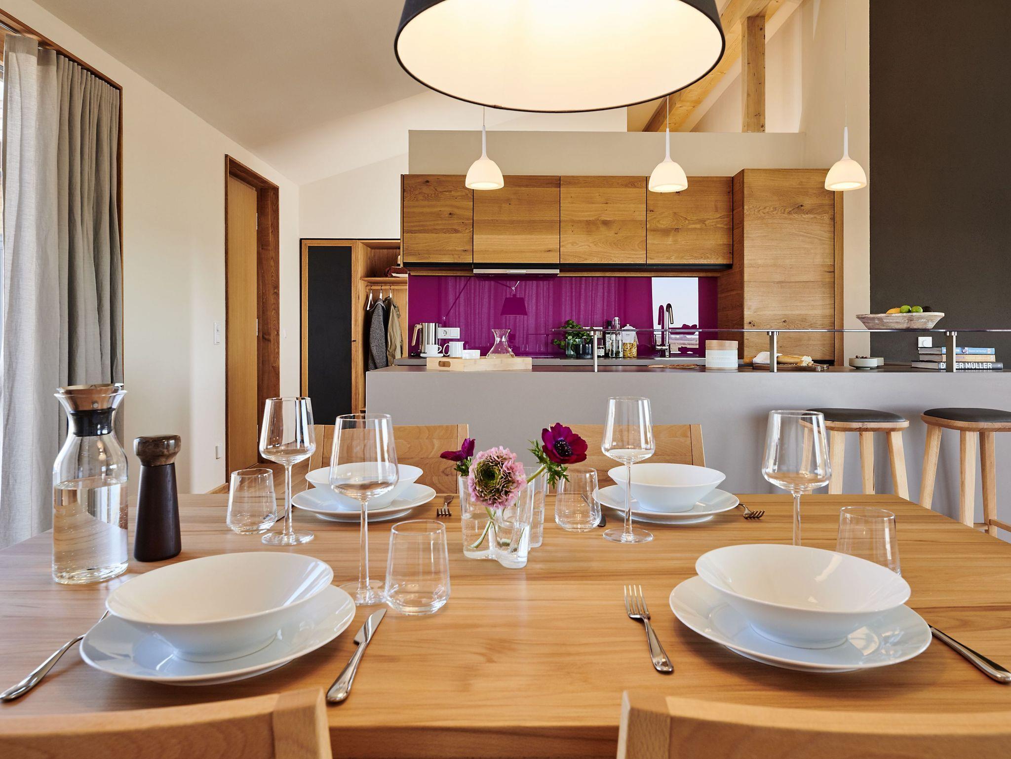 Der großzügige Wohnraum (40 m²) mit Essbereich, offener Küche und Tresen verfügt über einen 40“-TV mit SONOS Soundbar. Die Soundanlage kann über Ihr Smartphone mittels SONOS-App gesteuert werden. Die zwei Schlafzimmer verfügen jeweils über ein Doppelbett (160x200) und einen großen Einbauschrank. Bei Bedarf kann ein Zustellbett (80x200, gegen Gebühr) ergänzt werden. Ein Schlafraum ist mit einem 32“-TV ausgestattet. Alle Küchengeräte wie Induktionsherd, Spülmaschine und Kühlschrank mit 4-Sterne-Gefrierfach sowie Waschmaschine und Trockner stammen aus dem Hause Miele. Dank eines hochmodernen Glasfaseranschlusses (250 MBit) ist eine leistungsstarke Internetverbindung vorhanden (z.B. für Streaming). Das WLAN im Haus kann auf Wunsch deaktiviert werden.