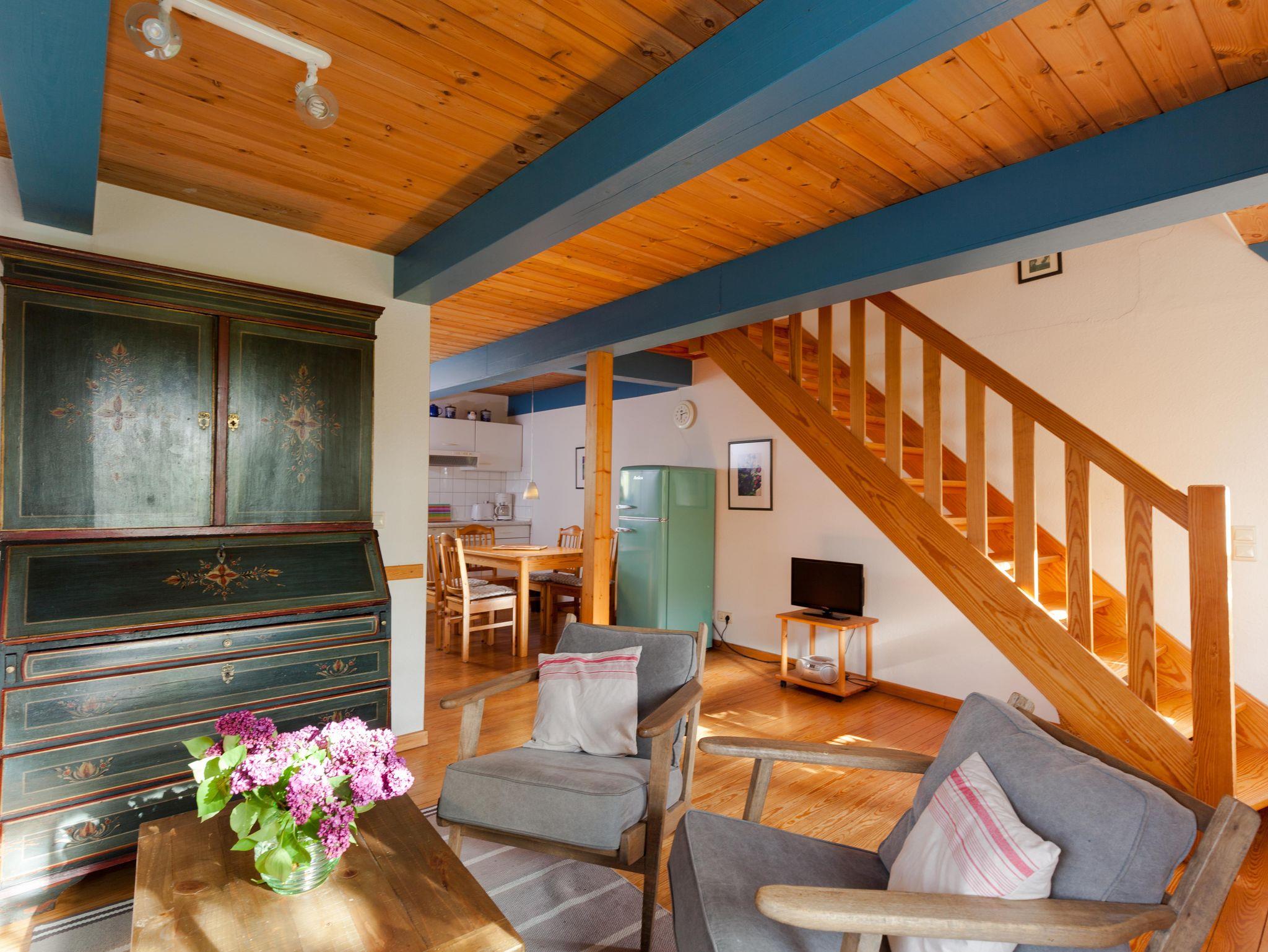 Ferienwohnung Eva-Lotta ist für 4 Personen ausgestattet, wobei Familien mit mehr als zwei Kindern ( bzw. einzelne Erwachsene mit mehr als drei Kindern) herzlich willkommen sind und ohne weitere Zuschläge untergebracht werden. Die Nichtraucher Wohnung ist zweistöckig (Erdgeschoß und Obergeschoß) und hat einen Schlafraum mit Doppelbett (Betten ohne Fußteil) und einen Schlafraum mit zwei Einzelbetten. Zusätzliche Betten wie Babybett und Zustellbett auf Anfrage. Die Küchenzeile ist voll ausgestattet, mit Backofen und Spülmaschine versehen, und mit Essecke und Wohnraum verbunden. WLAN ist vorhanden und kostenlos. Zur Wohnung gehört eine eigene Terrasse. Keine Haustiere.