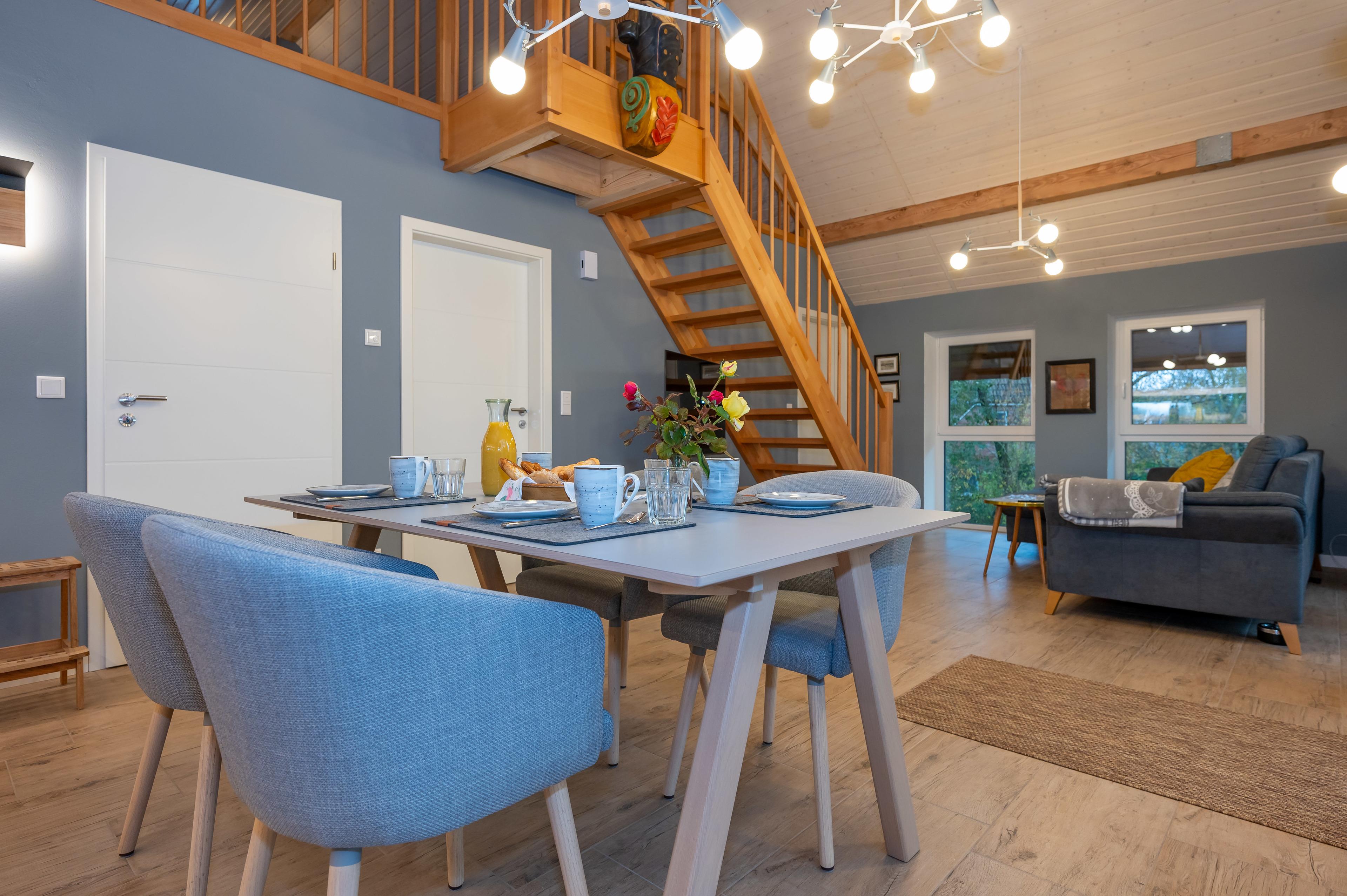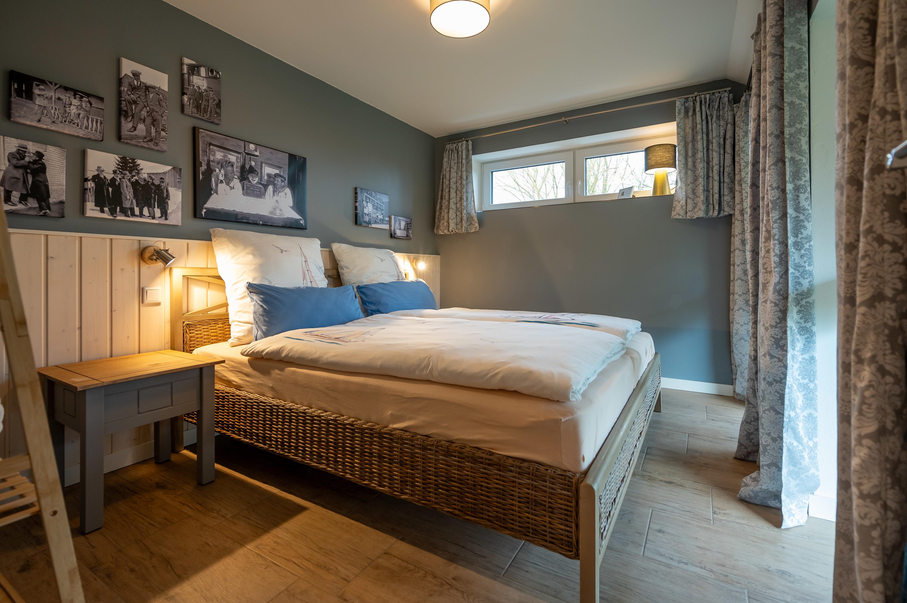 Das Penthouse Captains Bridge wird über eine Außentreppe zum überdachten Balkon erschlossen. Der Penthouse-Balkon ist überdacht und kann bei jedem Wetter genutzt werden. Mit seinem lichten Wohnzimmer mit Essküche von über 35 qm bietet das Penthouse viel Platz zum gemütlichen Zusammensein: Der Raum im ersten Obergeschoss erhält mit der Morgen-, Mittags- und Abendsonne Licht zum sich Wohlfühlen. Der Wohnbereich zeichnet sich durch eine offene Decke über zwei Geschosse aus. Eine Treppe führt zur großen Galerie. Dort oben eröffnet ein rundes Fenster unter dem Giebel den Blick ins Grüne. Dieses Raumerlebnis bestärkt das behagliche Gefühl, dass man an diesem Platz gut aufgehoben ist. Es gibt außerdem noch zwei helle Schlafzimmer mit gemütlichem Doppelbett sowie einem separaten Bad mit begehbarer Regendusche.