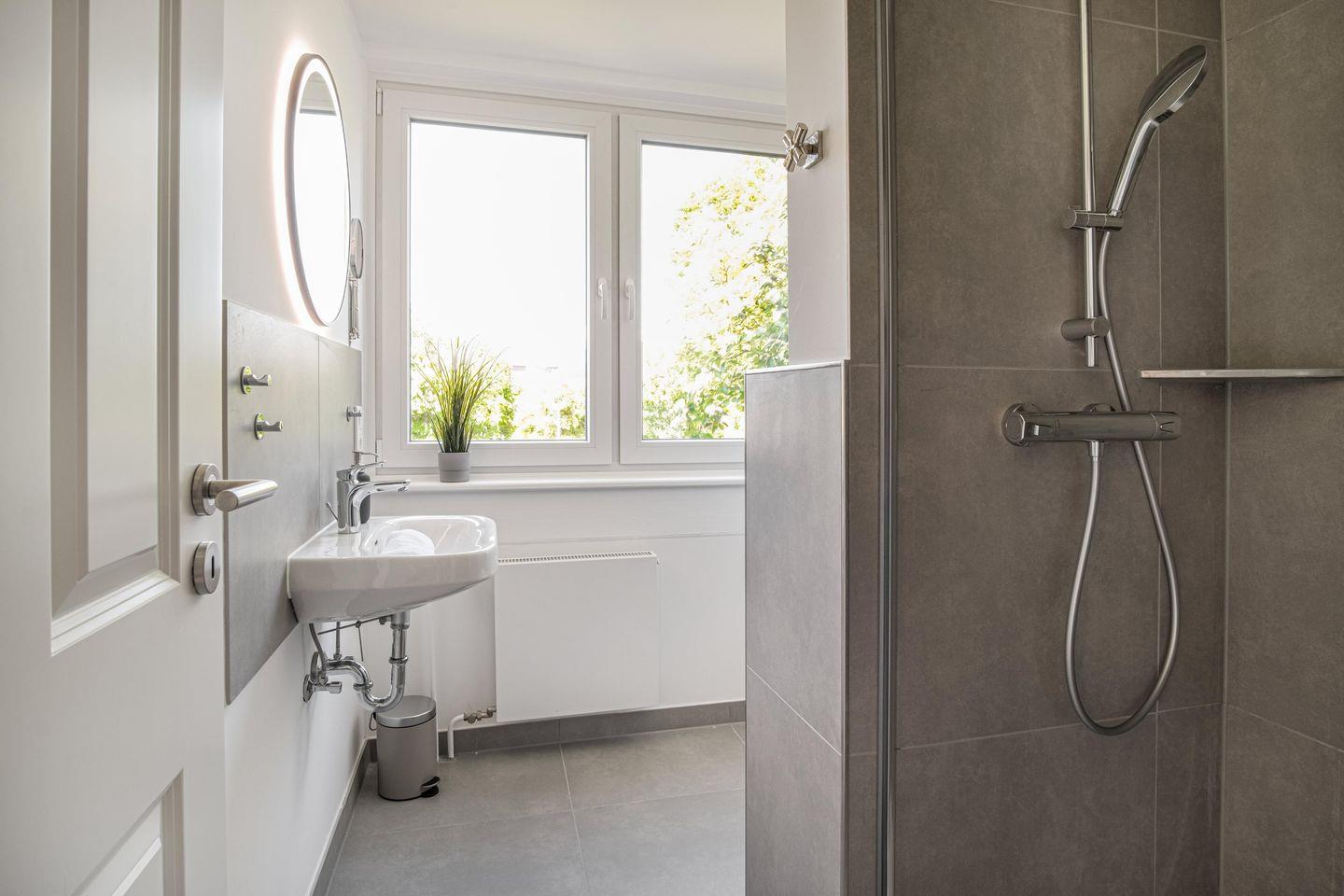Das moderne Badezimmer ist mit einer Dusche, einem Haartrockner und Pflegeprodukten wie Seife und Shampoo ausgestattet. Ein Ganzkörperspiegel sowie frische Hand- und Badetücher sind selbstverständlich vorhanden und sorgen für zusätzlichen Komfort.