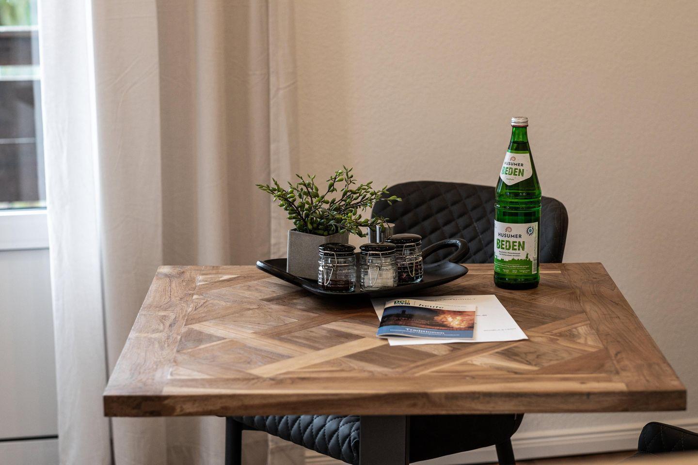 Die lichtdurchflutete Wohnung verfügt über ein geschmackvoll eingerichtetes Schlafzimmer oder Wohnbereich, der Ihnen den idealen Rückzugsort bietet, um nach einem aktiven Tag in der Natur zu entspannen. Die Küche, die elegant in das Wohnambiente eingebettet ist, ist mit modernen Annehmlichkeiten wie Cerankochfeld, Backofen, Kühlschrank, Mikrowelle, Geschirrspüler und weiteren Küchenutensilien ausgestattet. Hier können Sie ganz einfach kulinarische Genüsse zubereiten. Ein optionaler Brötchenservice kann Ihren Morgen noch genussvoller machen.