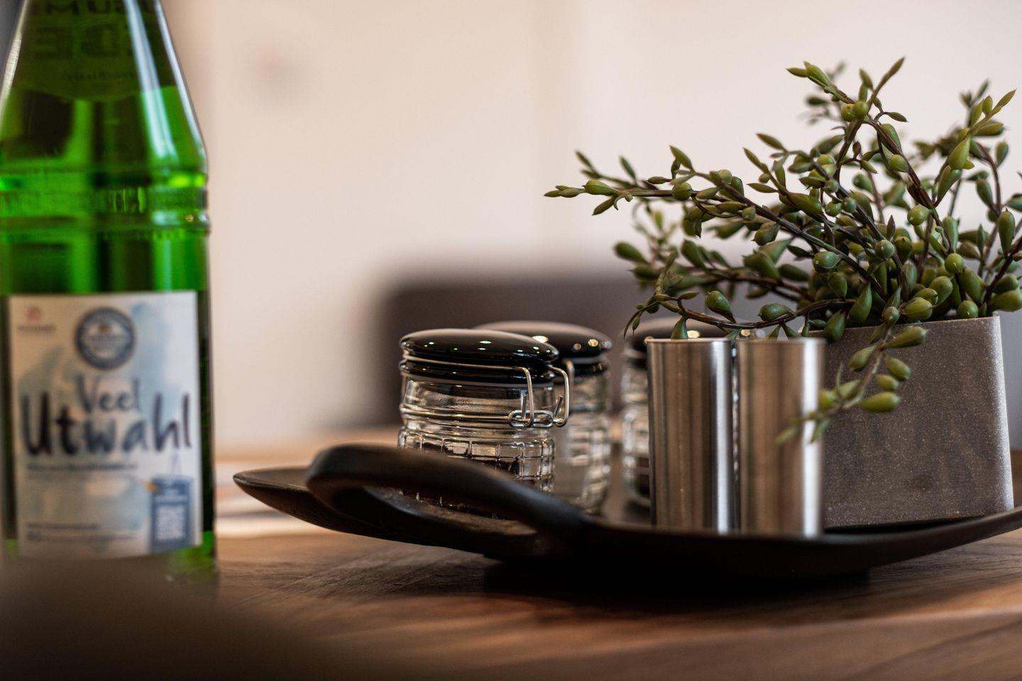 Die lichtdurchflutete Wohnung verfügt über ein geschmackvoll eingerichtetes Schlafzimmer oder Wohnbereich, der Ihnen den idealen Rückzugsort bietet, um nach einem aktiven Tag in der Natur zu entspannen. Die Küche, die elegant in das Wohnambiente eingebettet ist, ist mit modernen Annehmlichkeiten wie Cerankochfeld, Backofen, Kühlschrank, Mikrowelle, Geschirrspüler und weiteren Küchenutensilien ausgestattet. Hier können Sie ganz einfach kulinarische Genüsse zubereiten. Ein optionaler Brötchenservice kann Ihren Morgen noch genussvoller machen.