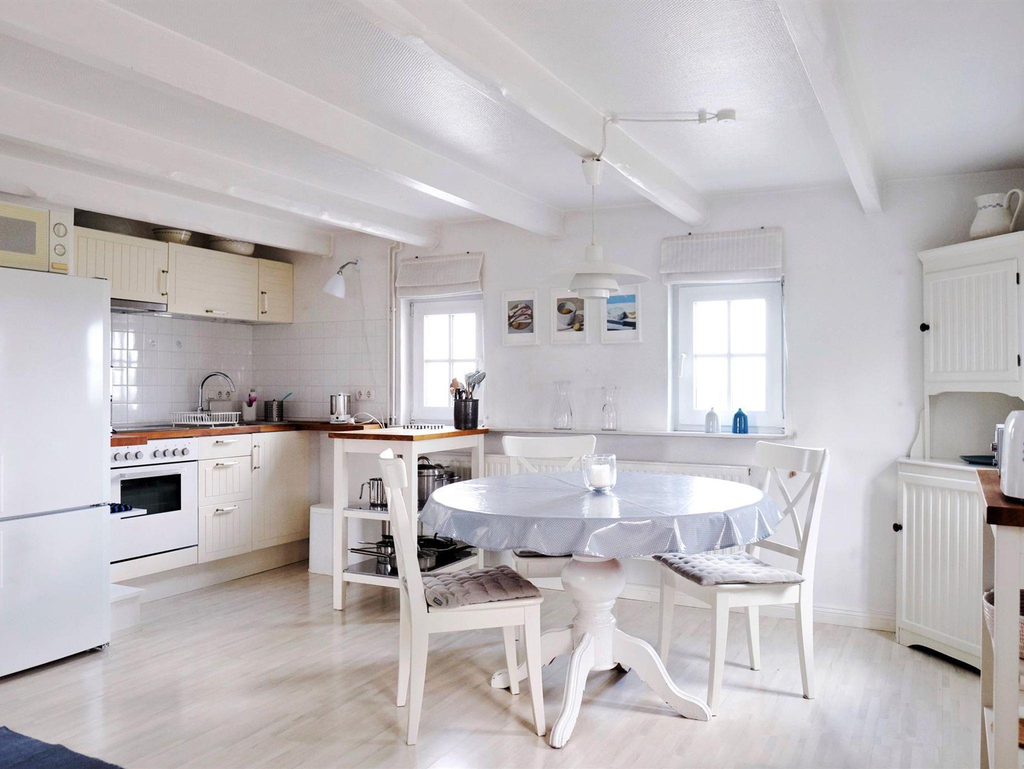 Im Erdgeschoss befinden sich die komplett ausgestattete Urlaubsküche mit Cerankochfeld, Backofen, Kühl-Gefrierkombination, Mikrowelle und Essbereich, die zum kreativen Kochen einlädt.