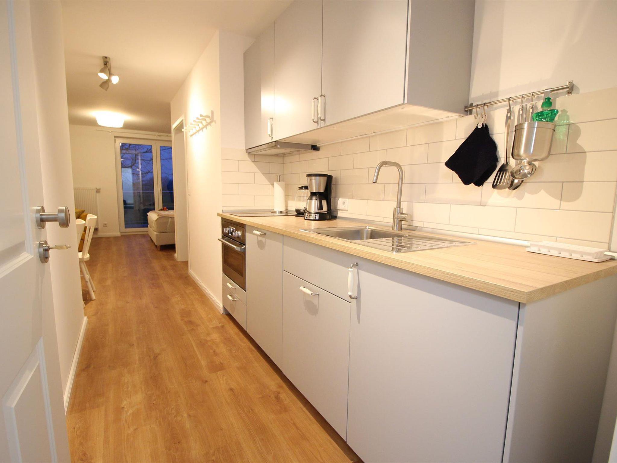 • Boxspring Doppelbett 1,60 x 2,00 m, Küchenzeile mit Geschirrspüler, Induktionskochfeld, Backofen, Kaffeemaschine, Wasserkocher, Toaster, Flachbildfernseher