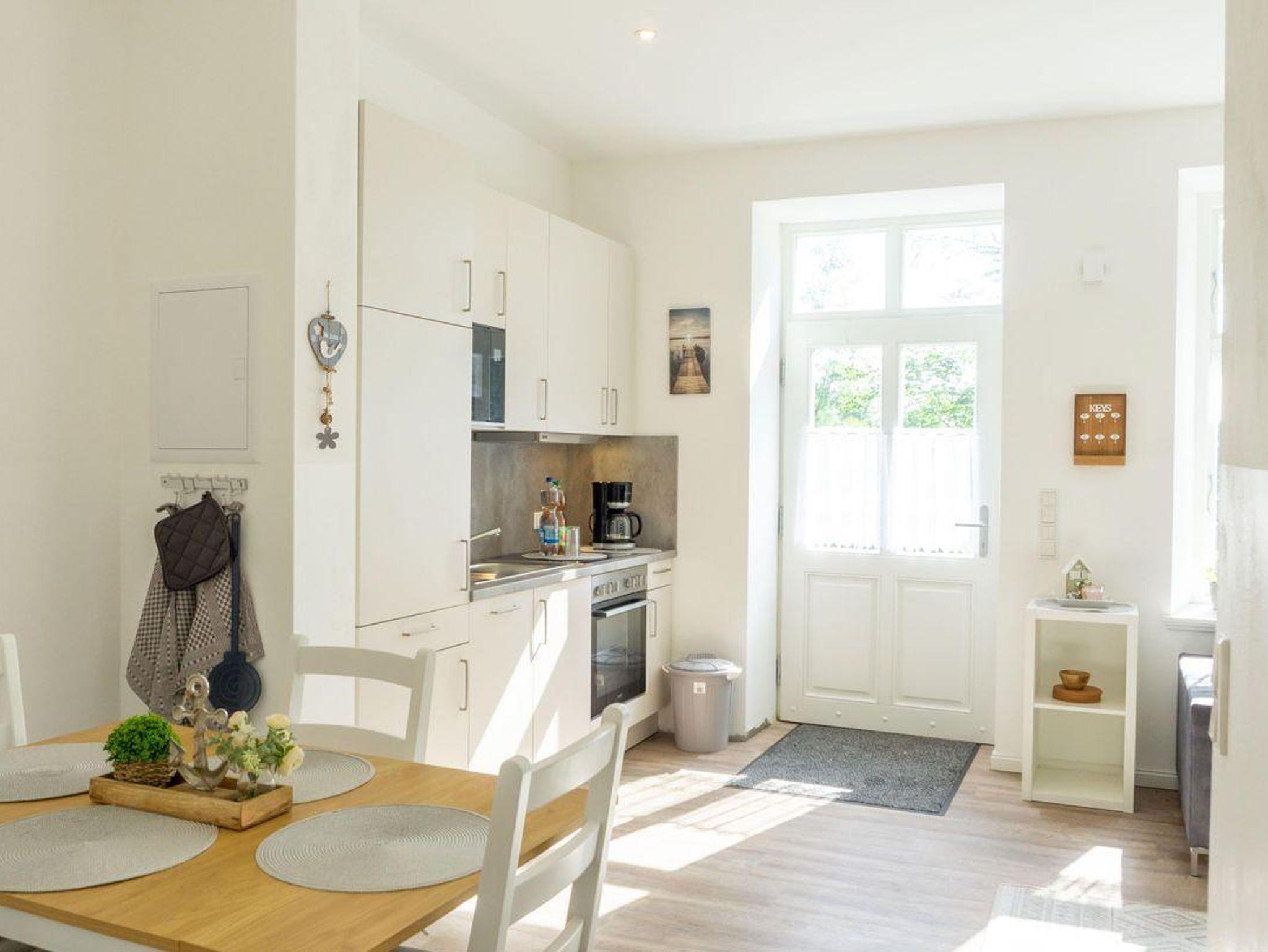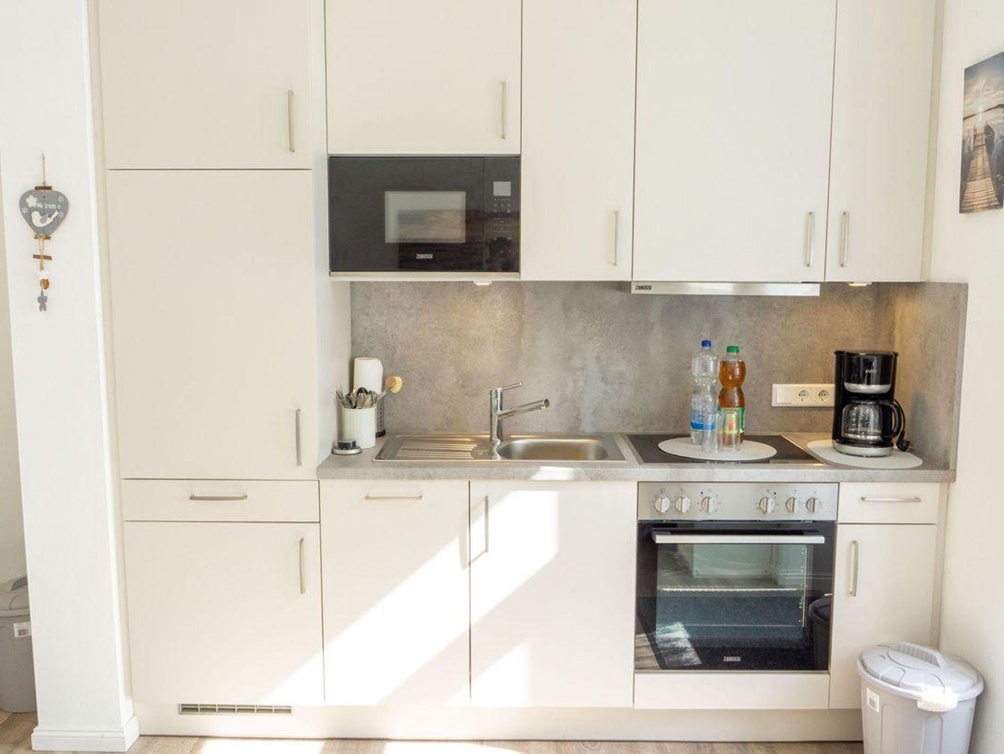 Die offene Küche ist modern und umfangreich eingerichtet. Sie ist zum Wohnzimmer hin offen gestaltet und mit Ceranherd, Mikrowelle, Kühlschrank mit Gefrierfach, Backofen, Spülmaschine, Wasserkocher, Toaster, Sandwich-Toaster, Kaffeemaschine, einer separaten Kaffee- und Teemaschine sowie Küchengeräten und allen nötigen Küchenutensilien, Geschirr, Besteck, Geschirrhandtüchern und Gewürzen ausgestattet. Ein Essbereich mit Esstisch lädt zu gemeinsamen Mahlzeiten ein.