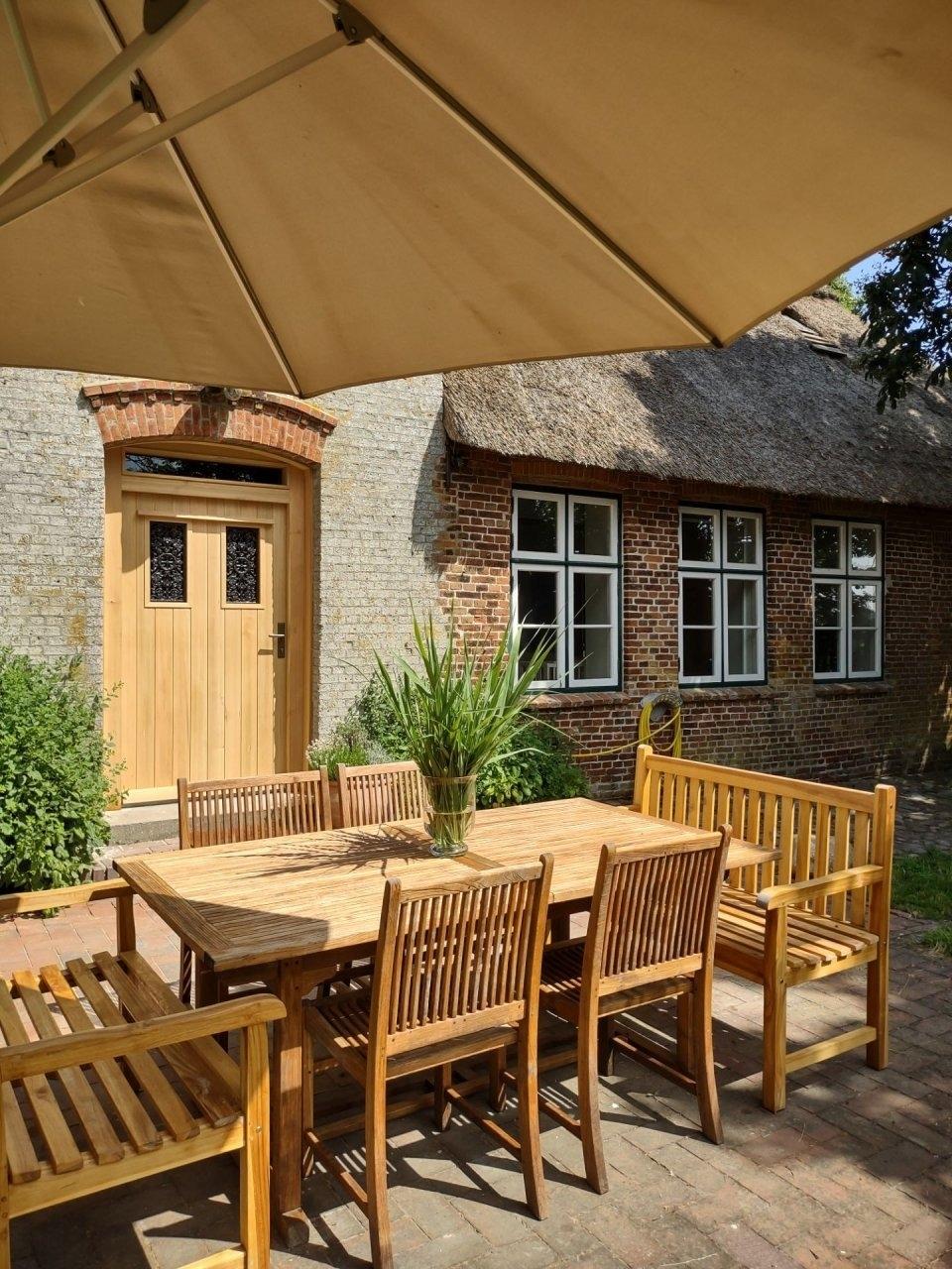 Entspannen Sie im historischen Reetdachhaus Eulenhof 1843 nahe St. Peter-Ording mit Garten, Sauna und moderner Ausstattung.