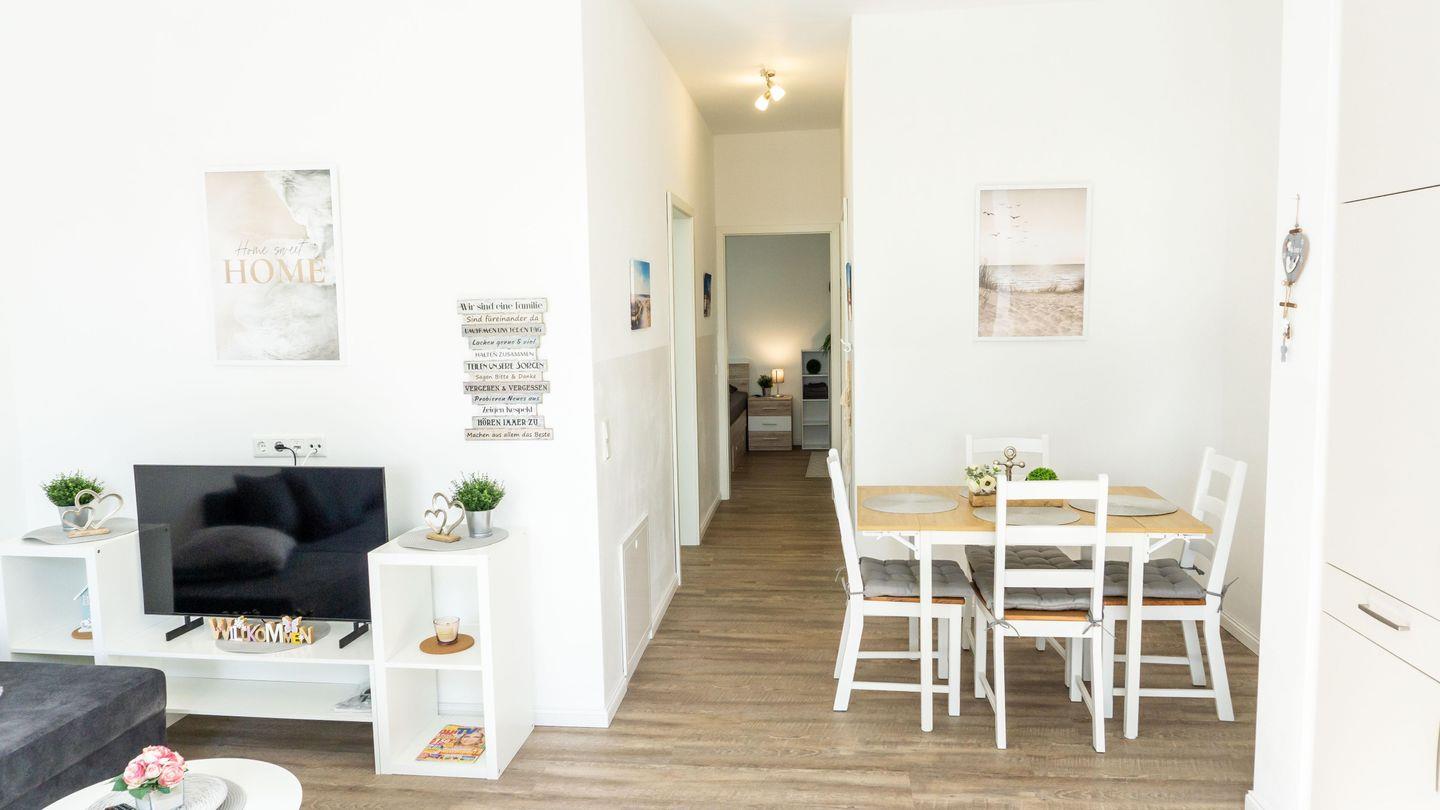 Der Wohnbereich der Wohnung überzeugt durch eine gemütliche Sofaecke, die mit einem großen Satelliten-TV (44–55 Zoll) mit internationalen Kanälen, einem CD-Spieler sowie Radio und Büchern ausgestattet ist. Der Bodenbelag in Wohn- und Schlafräumen besteht aus pflegeleichtem Vinyl, im gesamten Objekt sorgt eine angenehme Fußbodenheizung für Wohlbefinden zu jeder Jahreszeit. Eine Garderobe steht im Eingangsbereich zur Verfügung.