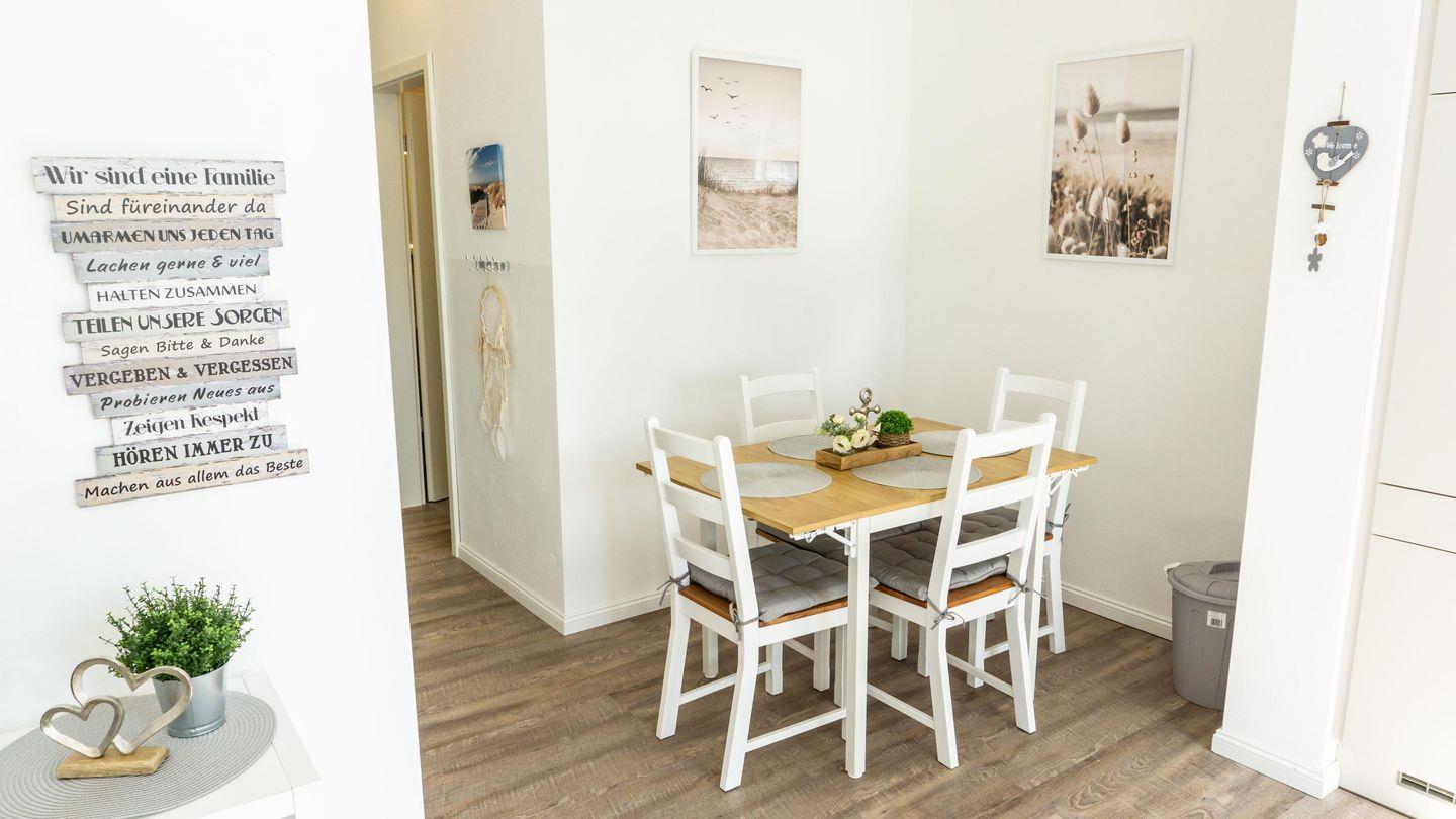 Die offene Küche ist modern und umfangreich eingerichtet. Sie ist zum Wohnzimmer hin offen gestaltet und mit Ceranherd, Mikrowelle, Kühlschrank mit Gefrierfach, Backofen, Spülmaschine, Wasserkocher, Toaster, Sandwich-Toaster, Kaffeemaschine, einer separaten Kaffee- und Teemaschine sowie Küchengeräten und allen nötigen Küchenutensilien, Geschirr, Besteck, Geschirrhandtüchern und Gewürzen ausgestattet. Ein Essbereich mit Esstisch lädt zu gemeinsamen Mahlzeiten ein.