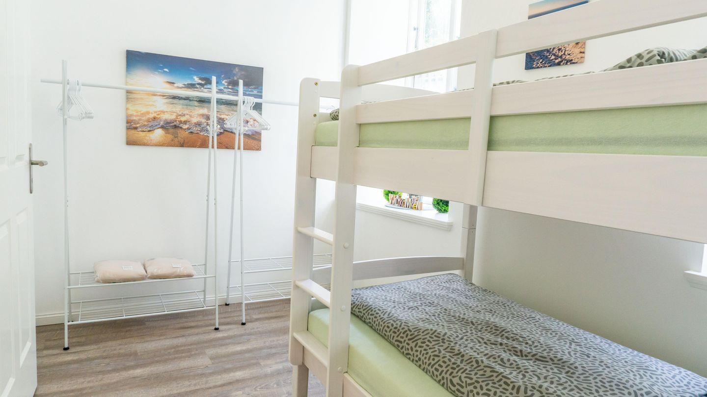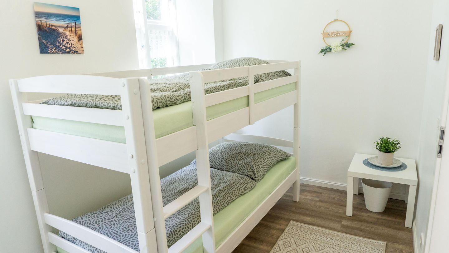 Die Aufteilung umfasst insgesamt 3 Zimmer, wovon 2 als Schlafzimmer gestaltet sind mit einem Doppelbett (200x180cm) und ein Etagenbett für 2 mit den Maßen (200x90cm) . Insgesamt finden bis zu 4 Personen komfortabel Platz. Die Unterkunft eignet sich hervorragend für Familien, Paare oder Freundesgruppen, wobei auch Babys und Kinder herzlich willkommen sind. Für Kleinkinder stehen ein Hochstuhl und ein Babybett bereit.