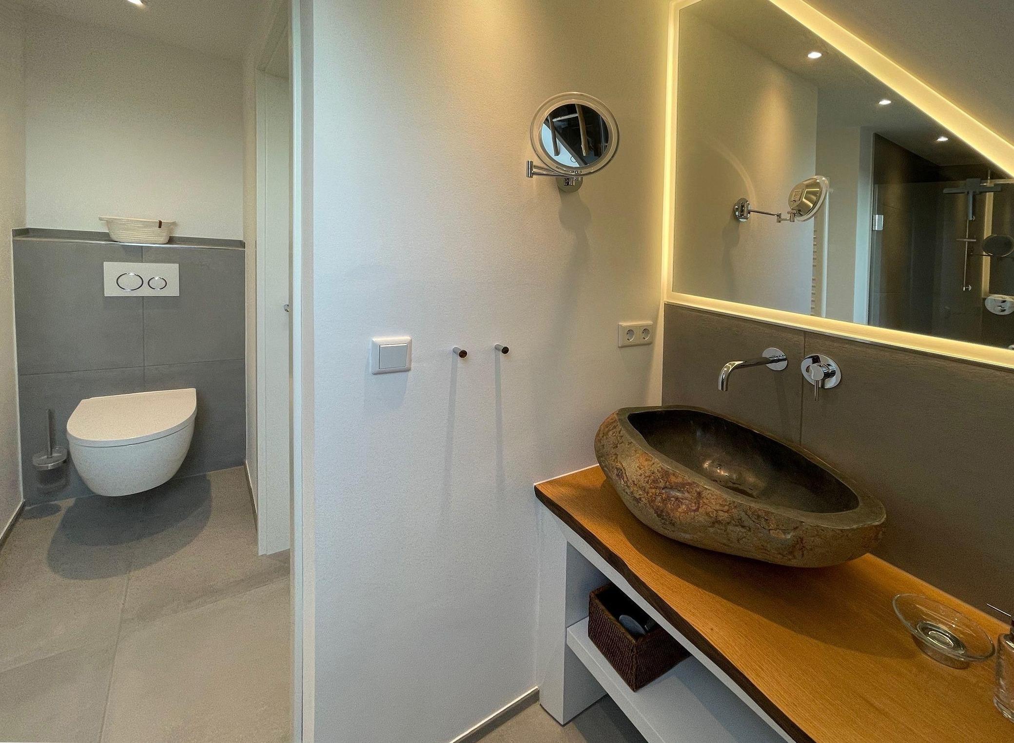 Über eine innenliegende Treppe gelangen sie in den stylischen, hellen Wohnraum mit wunderschönen Sitzgelegenheiten und traumhaftem Blick auf das Wattenmeer, einem Essplatz am Fenster zur Düne für 4 Personen, eine moderne offene Küche mit bester Ausstattung und einem neu gestalteten Badezimmer mit ebenerdiger Dusche.