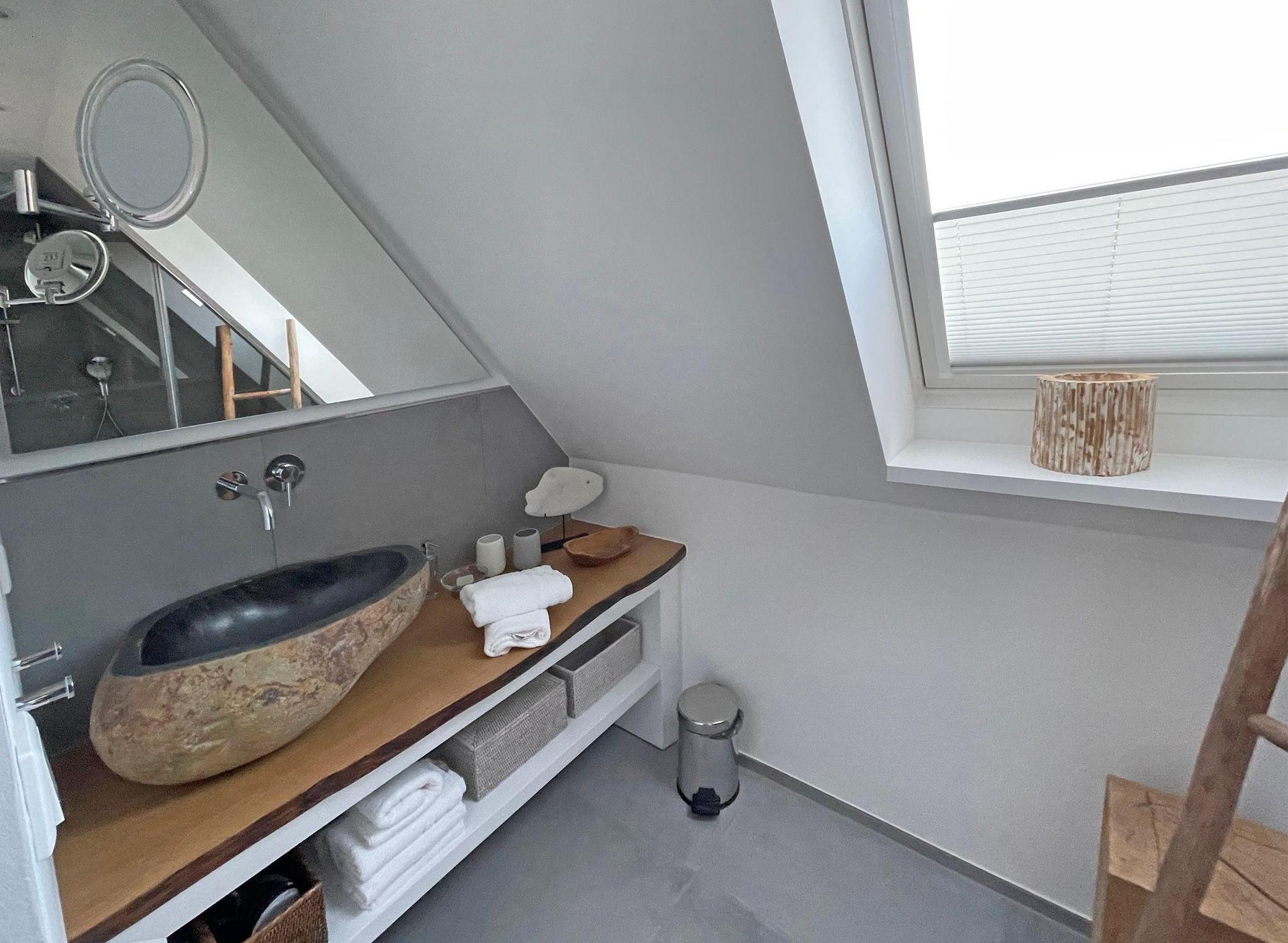 Im Obergeschoss finden sie ein neues, herrlich bequemes Boxspringbett, weiße Schrankeinbauten, einen modernen Flachbildfernseher, gemütliche Beleuchtung und dem Fensterblick zum Meer.
